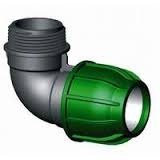 One end of the elbow joint has a 1" male threaded end, the other end is fitted with a KPE 32 pipe with a locking ring.