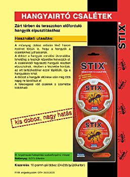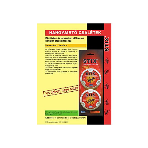 Návod na použitie: Odtrhnite tri jazyky na boku plastovej škatuľky, aby sa mravce dostali k návnade. Umiestnite škatuľku na trasu pohybu mravcov, najlepšie blízko ich hniezda. Mravce, ktoré návnadu konzumujú, čiastočne hynú a čiastočne ju nosia do hniezda, kde ňou kŕmia ostatné jedince, čím sa hniezdo vyľudní. Škatuľku neodstraňujte niekoľko dní po vymiznutí mravcov. Nepoužitú návnadu vyhoďte do odpadu. Po použití prípravku si dôkladne umyte ruky teplou vodou a mydlom. Uchovávajte oddelene od potravín, mimo dosahu detí a domácich zvierat. Umiestnite tak, aby k nej deti a domáce zvieratá nemali prístup. 10 g gélu/škatuľka Voľnopredajný prípravok skupiny III. Použitie: Na hubenie mravcov v uzavretých priestoroch a na terasách Účinná látka: 0,1 % bifentrín Vyrobené: Víkem-Kwizda (Marly le Roi, Francúzsko) Distribuuje: Magyar Kwizda Kft., 1027 Budapešť, Medve u. 24 Číslo povolenia: OTH 2600/2005 Trvanlivosť: V originálnom uzavretom obale, skladované na suchom, chladnom mieste, použiteľné do 2 rokov od dátumu výroby. (dátum výroby je uvedený na škatuľke)