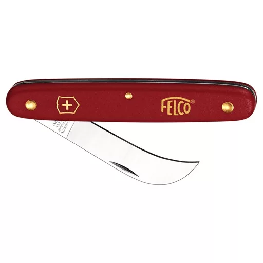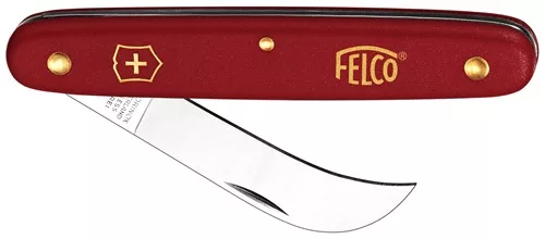 Dĺžka: 100 mm Hmotnosť: 55 g Dĺžka čepele: 57 mm Použitie a Charakteristiky: ľahký ohnutý nožík na rezanie, červená plastová rúčka s vložkou zo štandardnej zliatiny, nerez z ušľachtilej ocele. Tieto náradia vyhotovuje chýrny VICTORINOX , výrobca nožov a do obehu sa dostávajú pod značkou FELCO. V prvom rade bol vyvinutý pre stromové škôlky, pre očkovacie práce viníc a záhradníctiev, ale výborne sa hodia aj pre aranžérov kvetov, ktorý pri zostavovaní kytíc radi používajú ostré nože.
