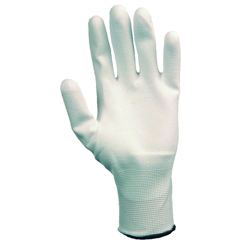 -pletené, pružné, veľká pevnosť v ťahu 100% polyamid vlákno - na dlani máčané bielym polyuretánom - biele precíznerukavice s gumírovanou manžetou, vetrateľný chrbát ruky