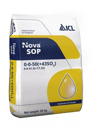 Nova SOP 0-0-50 + 43SO3 je hnojivo síranu draselného pre špeciálne hnojivá ICL. Široko používaný zdroj draslíka pre hydroponicky pestované rastliny. Produkt sa môže použiť v akomkoľvek systéme na riedenie živín.
