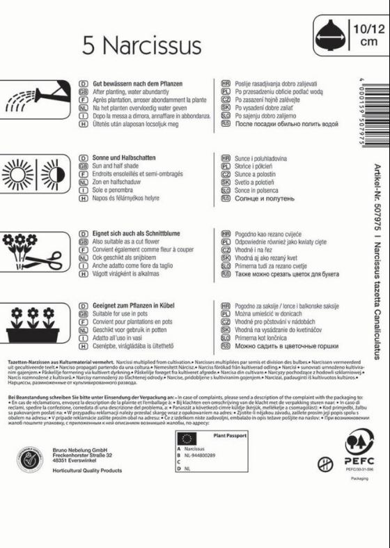 | Pestovanie | Tieto cibule sú pripravené na skoré kvitnutie v interiéri. Vysaďte ich čo najskôr alebo ich uchovávajte na chladnom a tmavom mieste. Ak majú cibuľky pri prevzatí zelené výhonky, nemali by sa odstraňovať. |