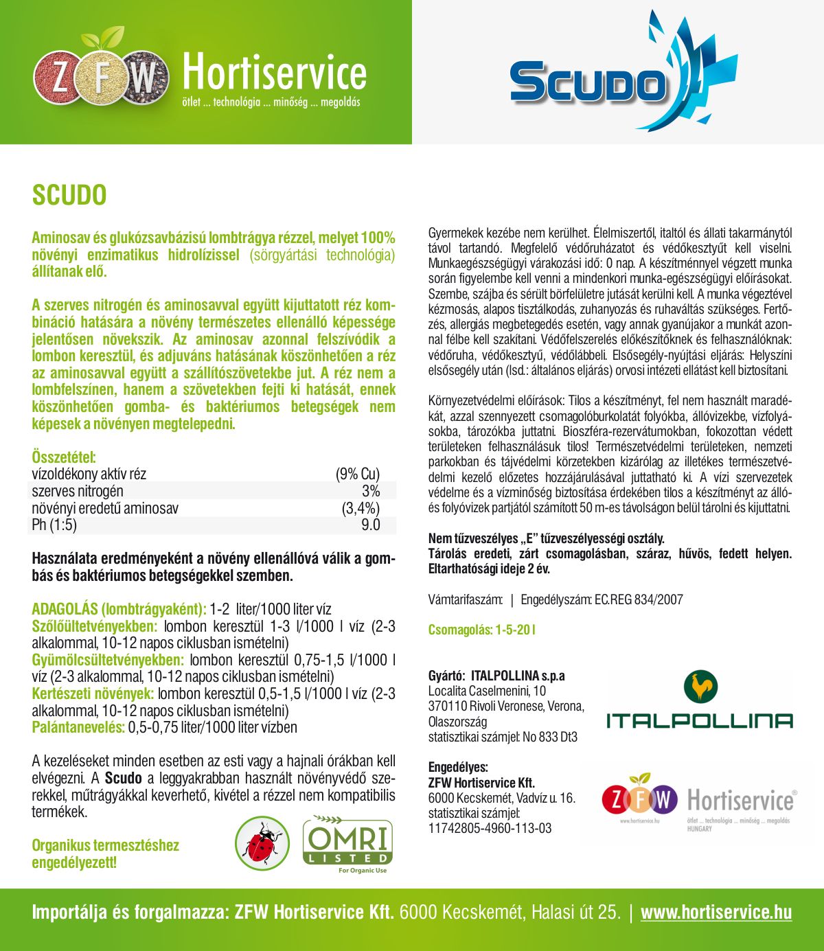 SCUDO je špeciálne listové hnojivo na báze aminokyselín a kyseliny glukózovej s obsahom aktívnej medi (9 % Cu) a aminokyselín (3,4 %). SCUDO sa vyrába 100% rastlinnou enzymatickou hydrolýzou (pivovarnícka technológia). Kombinácia medi aplikovanej s organickým dusíkom a aminokyselinami výrazne zvyšuje prirodzenú odolnosť rastliny. Aminokyseliny sú okamžite absorbované cez listy a meď je spolu s nimi transportovaná do transportných tkanív. Meď nepôsobí na povrchu listov, ale v tkanivách, čo zabraňuje kolonizácii rastliny hubovými a bakteriálnymi chorobami.