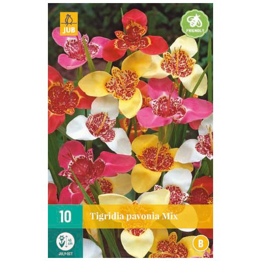 Tigridia pavonia hybrid (tigrí kvet alebo mexický mušľový kvet) má 15 cm veľké trojuholníkové kvety. Má trojuholníkový tvar s tromi trojuholníkmi s veľkosťou 3 až 5 cm a je veľmi farebná. Listy pripomínajú mečové kvety alebo kosatce. Rastlina má niekoľko kvetov na vetve, pričom každý kvet kvitne len niekoľko dní. Výška 45 cm.