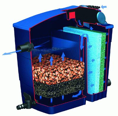 A szűrő kialakítása lehetővé teszi, hogy a víz több időt töltsön el a szűrő közegekben ezáltal növelve a mechanikai illetve a biológiai szűrés hatékonyságát.