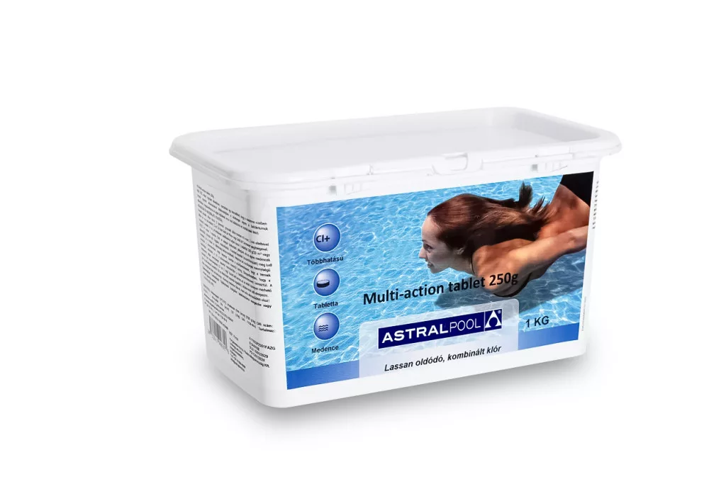 Viacfuknčná 250 gramová tableta na úpravu vody so stabilizovaným obsahom chlóru. Pomalé a rovnomerné rozpúšťanie zabezpečuje priebežný dezinfekčný účinok. Obsahuje súčasne algicídne a flokulačné zložky pre krištáľovo čistú bazénovú vodu.