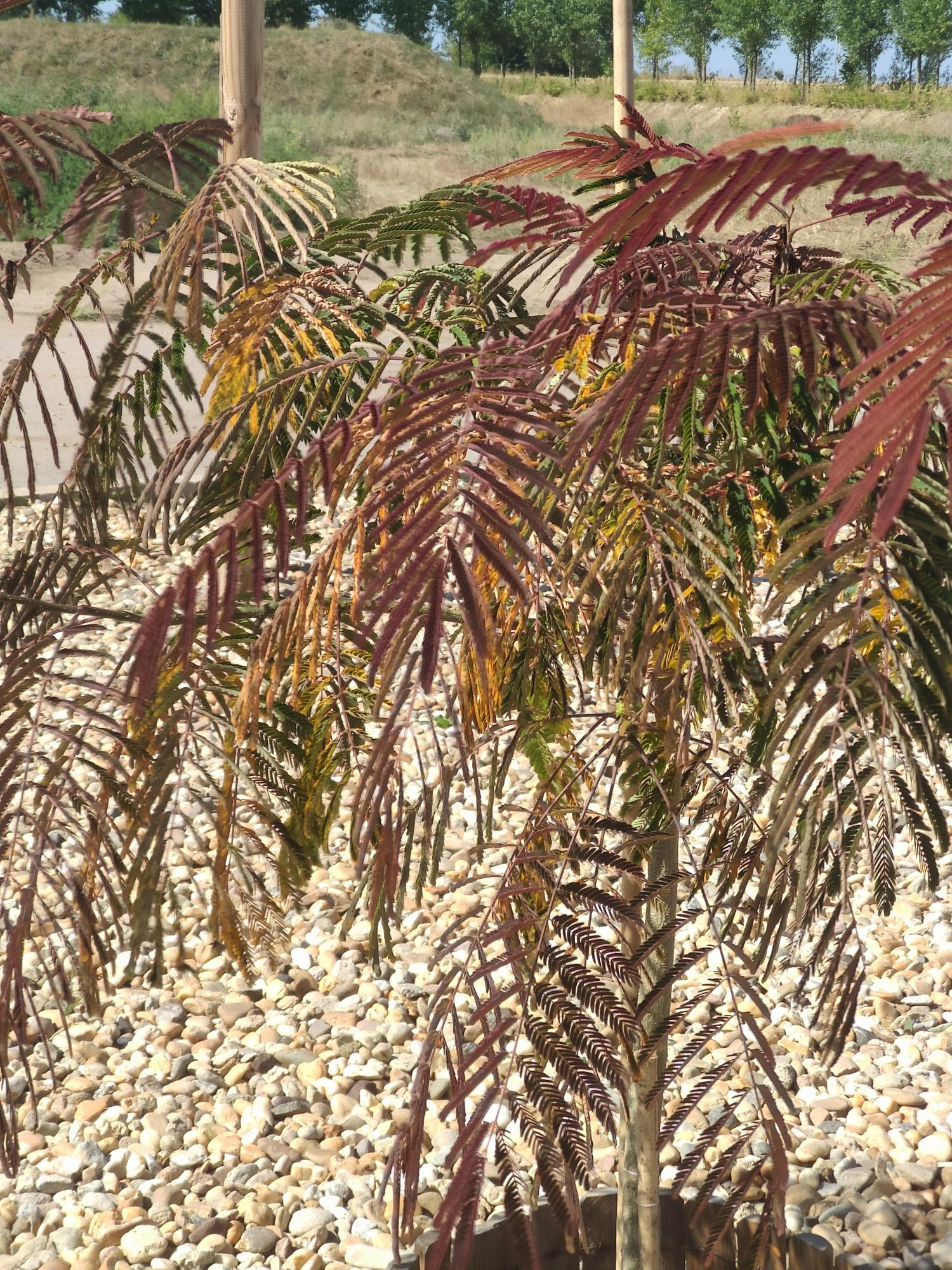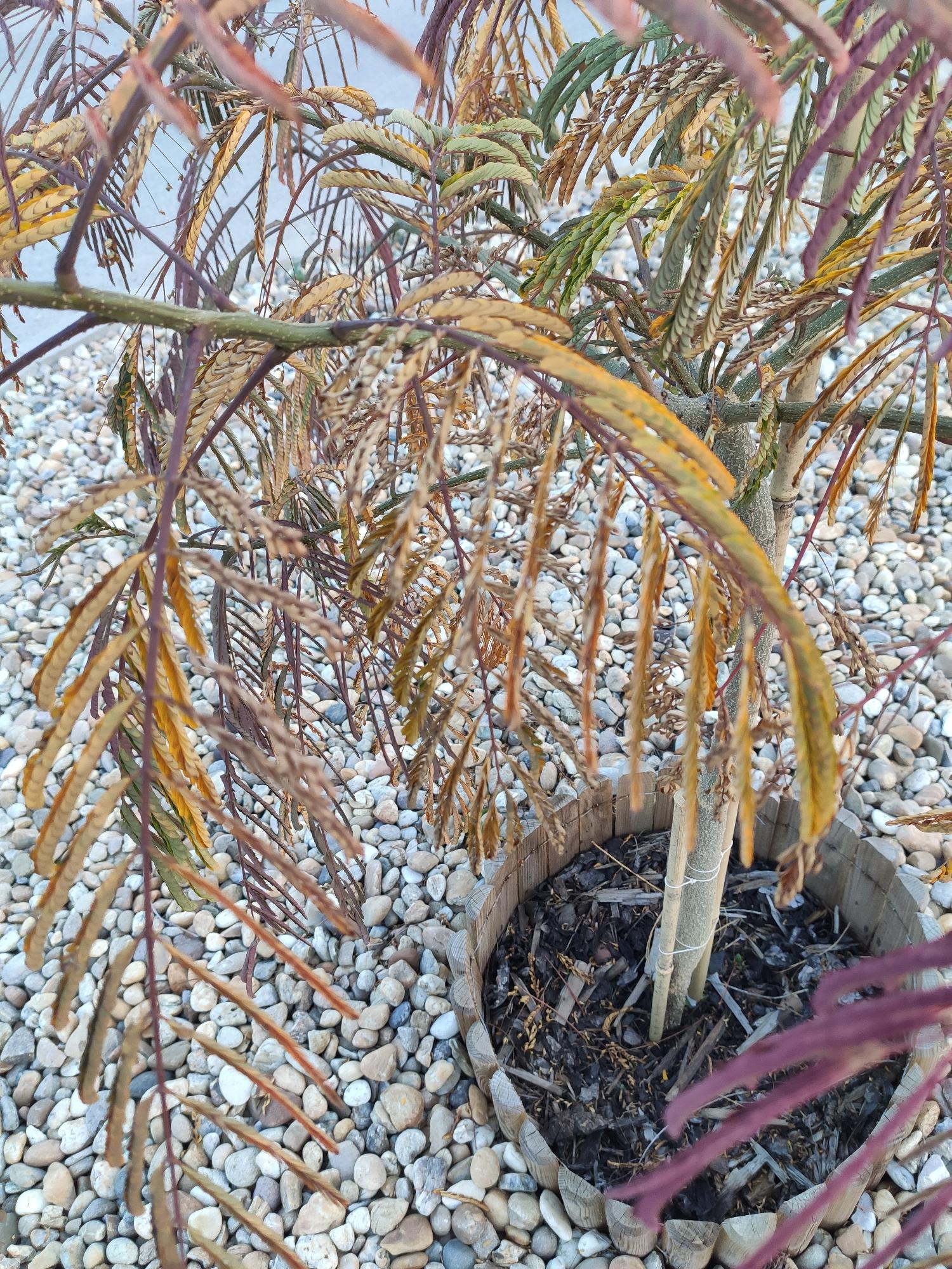 Kedves Lívia! Napégés, magas UV, hőség az oka, amire a sötét levelű változat (talán Summer Chocolate) fokozottabban érzékeny. A kavics visszaveri a fényt, a hőt. Sürgősen el kell távolítani a növény körül, és sötétebb színű kéregre vagy lávakőre cseréni, vagy a növényt átültetni. A hulló apró leveleket a kavicsból amúgy is nehéz kiszedegetni, a tetvek (vagy inkább selyemakác-levélbolha) mézharmata pedig ragacsossá teszi a felületet.