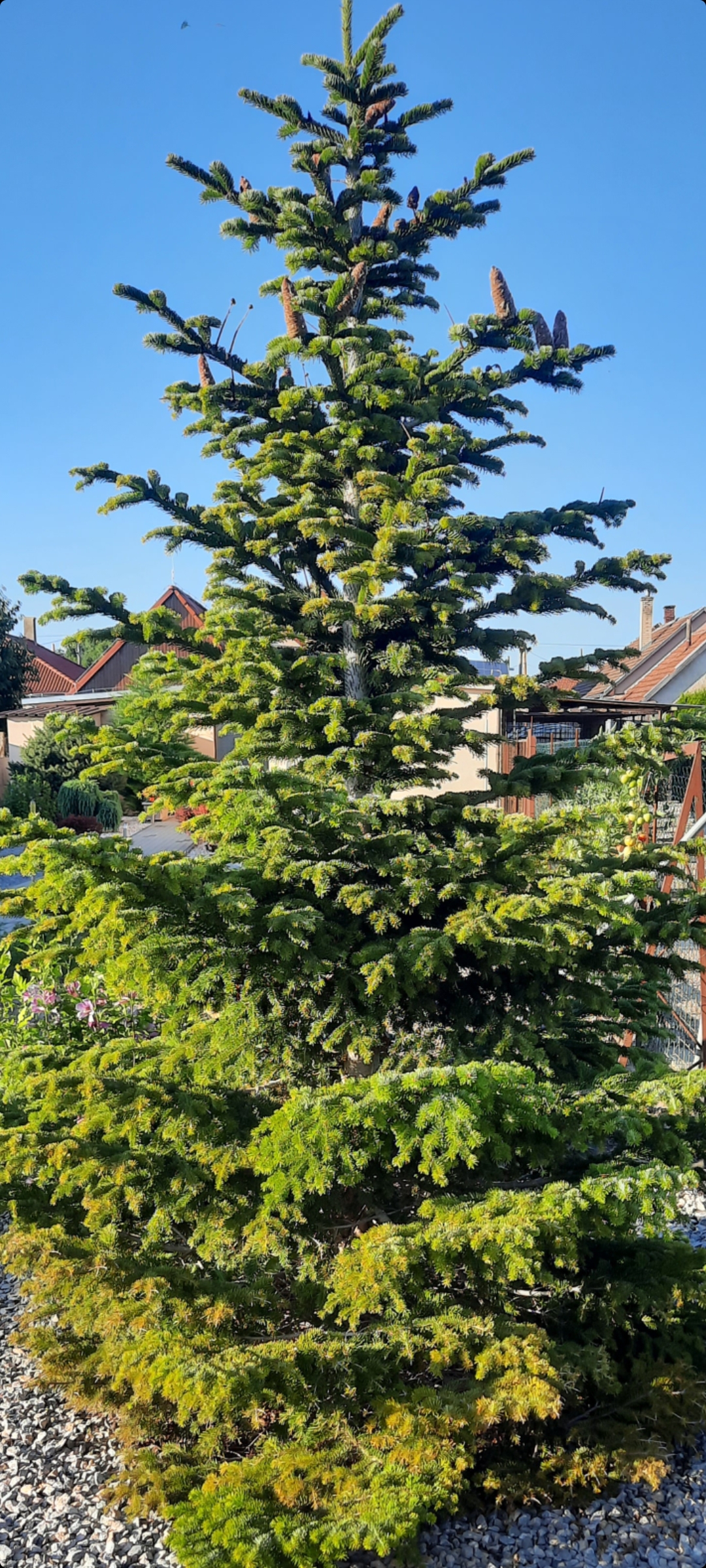Igen, lehet balzsamfenyő. Viszont elég rossz állapotban van, meglehetősen tápanyaghiányos, mivel az alatta lévő zúzalék miatt folyamatosan bemosódik a mész a talajba, ami kifejezetten káros. A zúzalékot cserélje sürgősen fenyőkéregmulcsra, és adjon a növénynek örökzöld tápoldatot és lombtrágyát is. Hosszú távon tartós hatású trágyát dolgozzon a talajba.