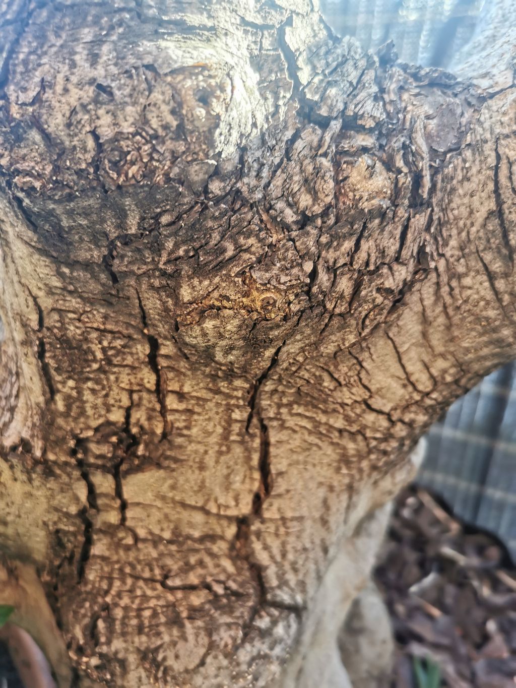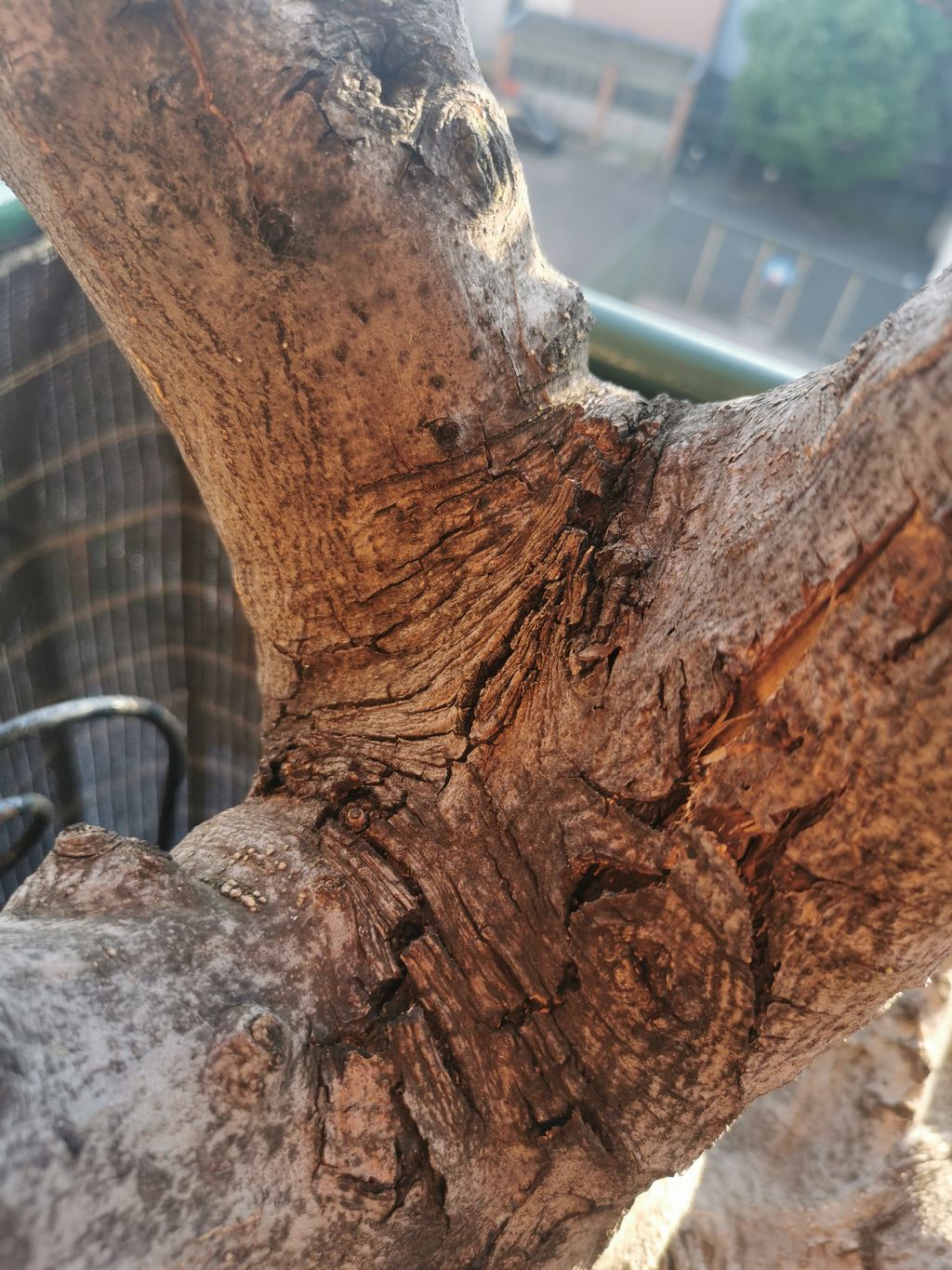 D-DNY-i fekvésű teraszomon konténerben nevelt idős olajfám törzsén a kéreg száraz, repedt, helyenként leválik. Élősködőt nem látok rajta. Egyébként szépen hajt , virágzik.