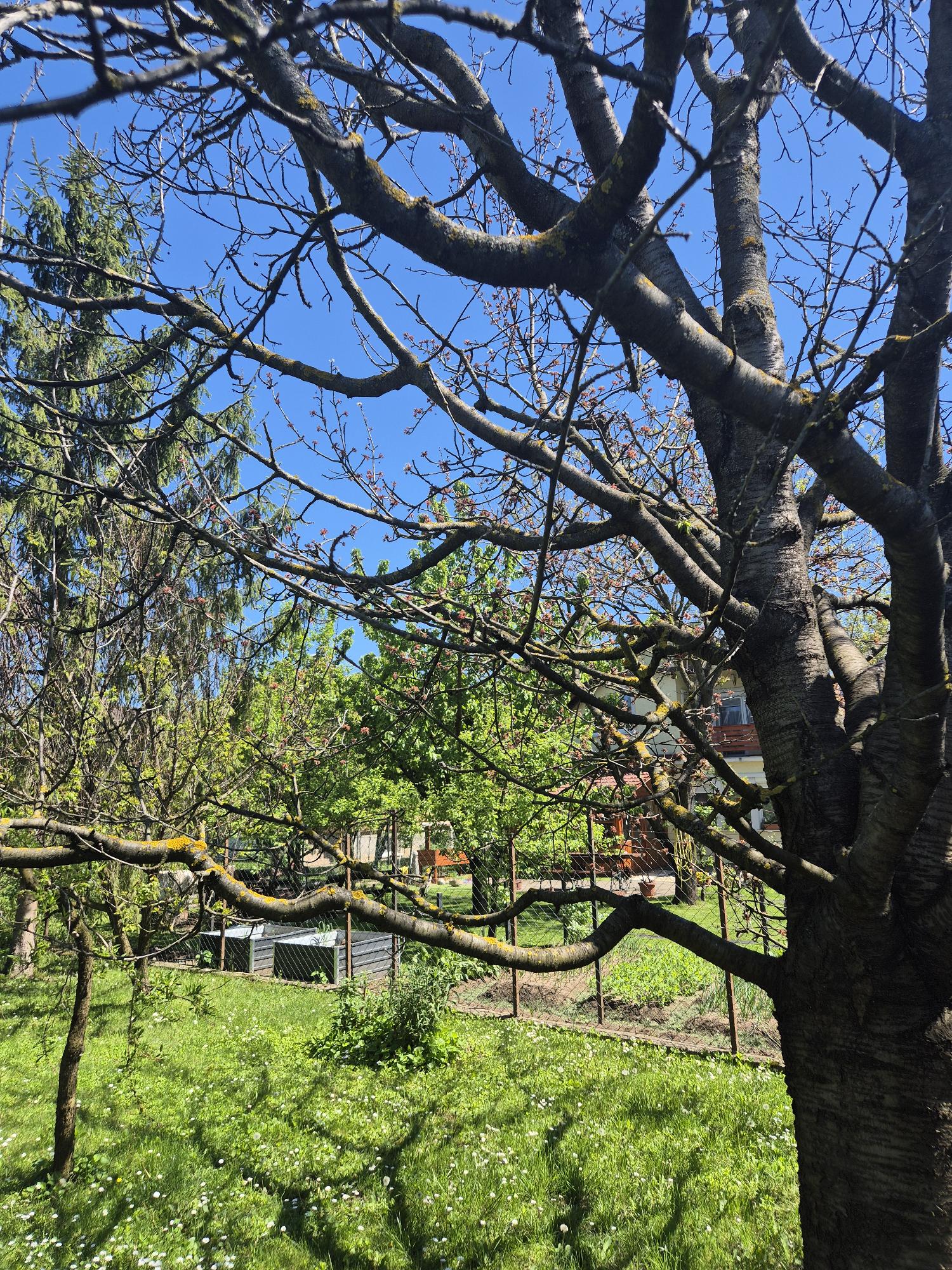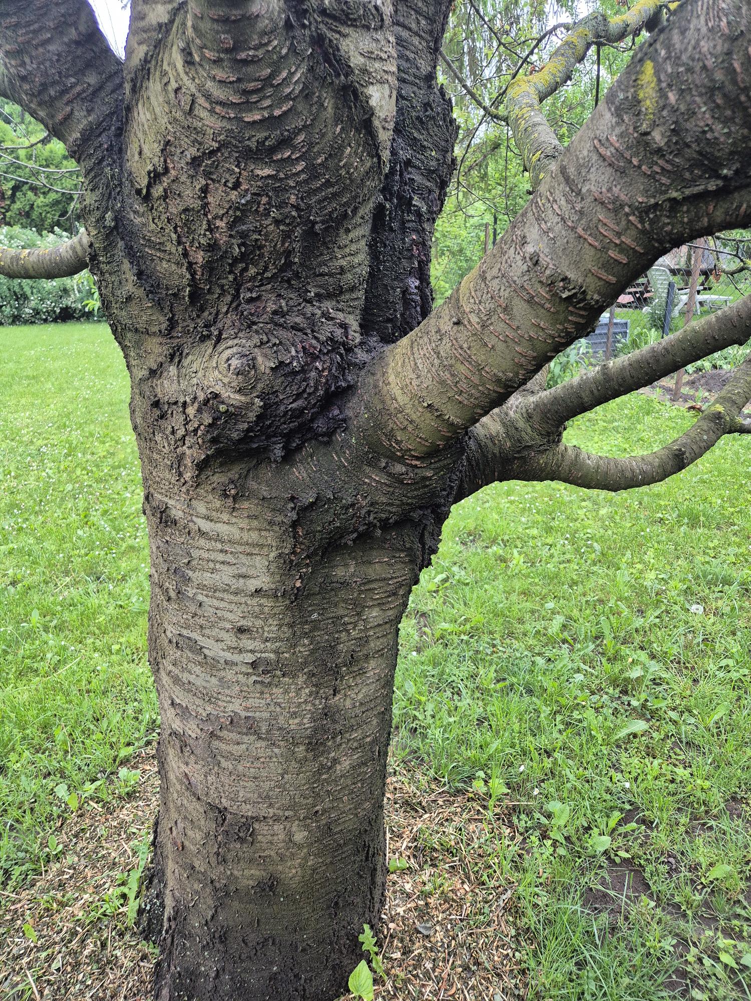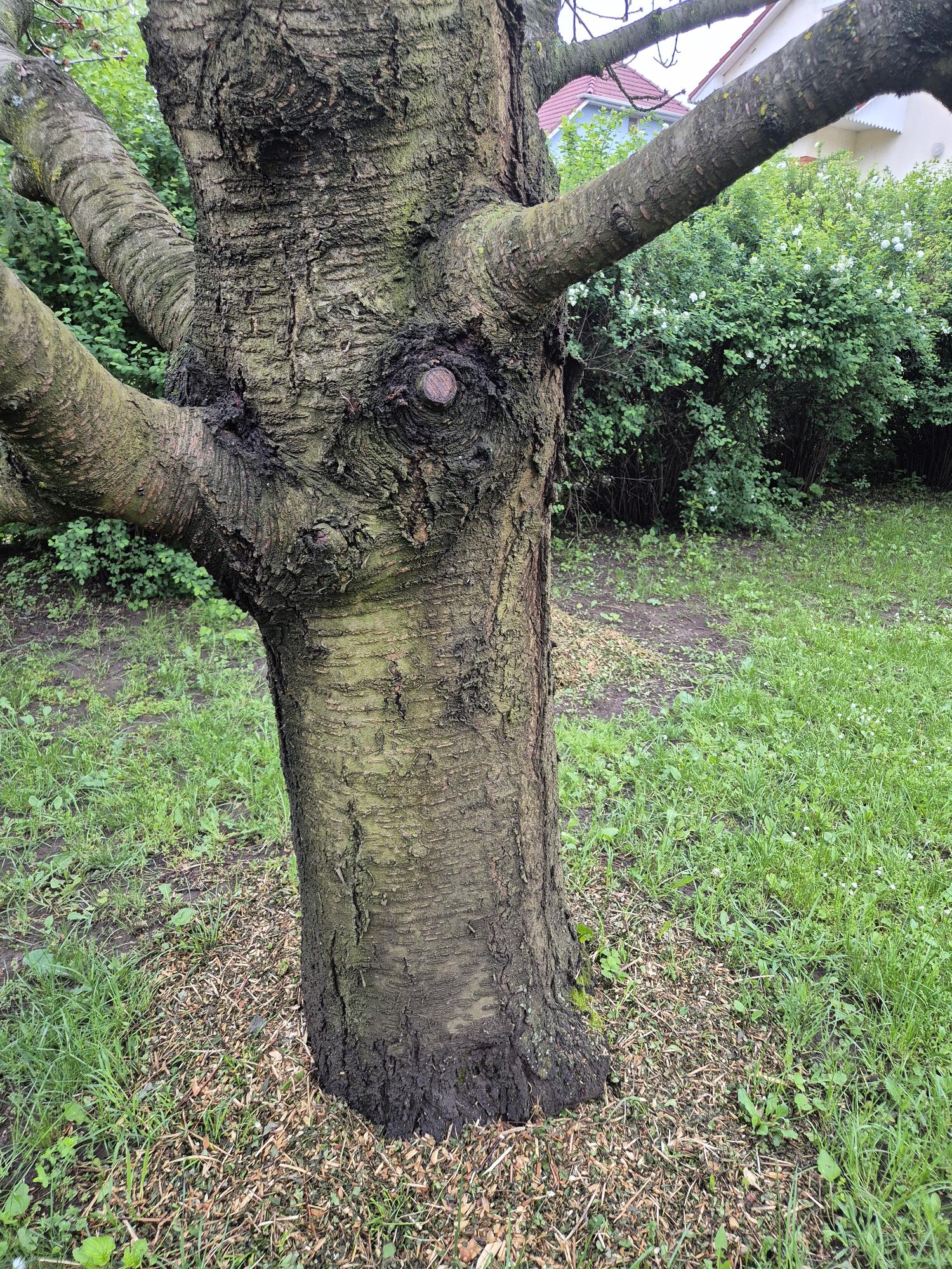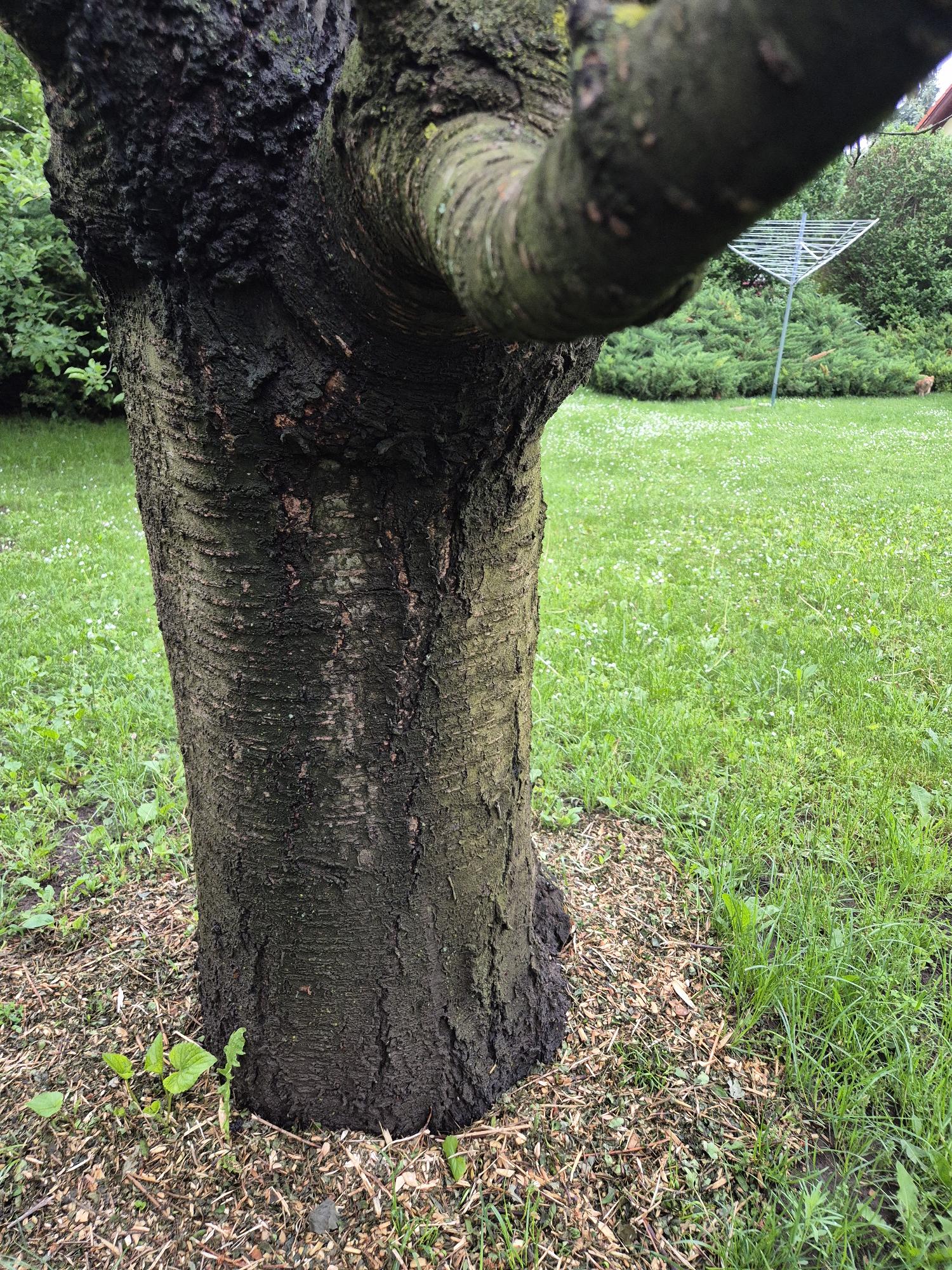 Kedves Tibor! Köszönöm a képeket. A cseresznyefa törzse egészségesnek tűnik, mégis a föld feletti részen kisebb beszűkülés látható.Jó lenne kis kapával elhúzni a földet a törzs földben lévő részénél és megnézni, mi található ott. Lehet ott gomba-fertőzés - pl. az Armillaria, amelynek a termőteste szeptember-októberben jelennek meg a törzsnél és láthatóvá válnak a világosbarna,5-6 cm átmérőjű kalapos gombák. Ez a fakorhasztó betegség nem gyógyítható. Mégis - hiszen addig ez csak feltételezés. Ajánlom, hogy a fát vissza kell vágni a hajtásvégeken 20-25 cm mélységben. A metszés elősegítheti az újraindulást. A fa öregnek látszik. Ha idősen nem is, fiatal korában sokat öntözhették, de a talajvíz is magas lehet. Ez építkezésnél vagy nagy eső idején a pince mélységében megállapítható.