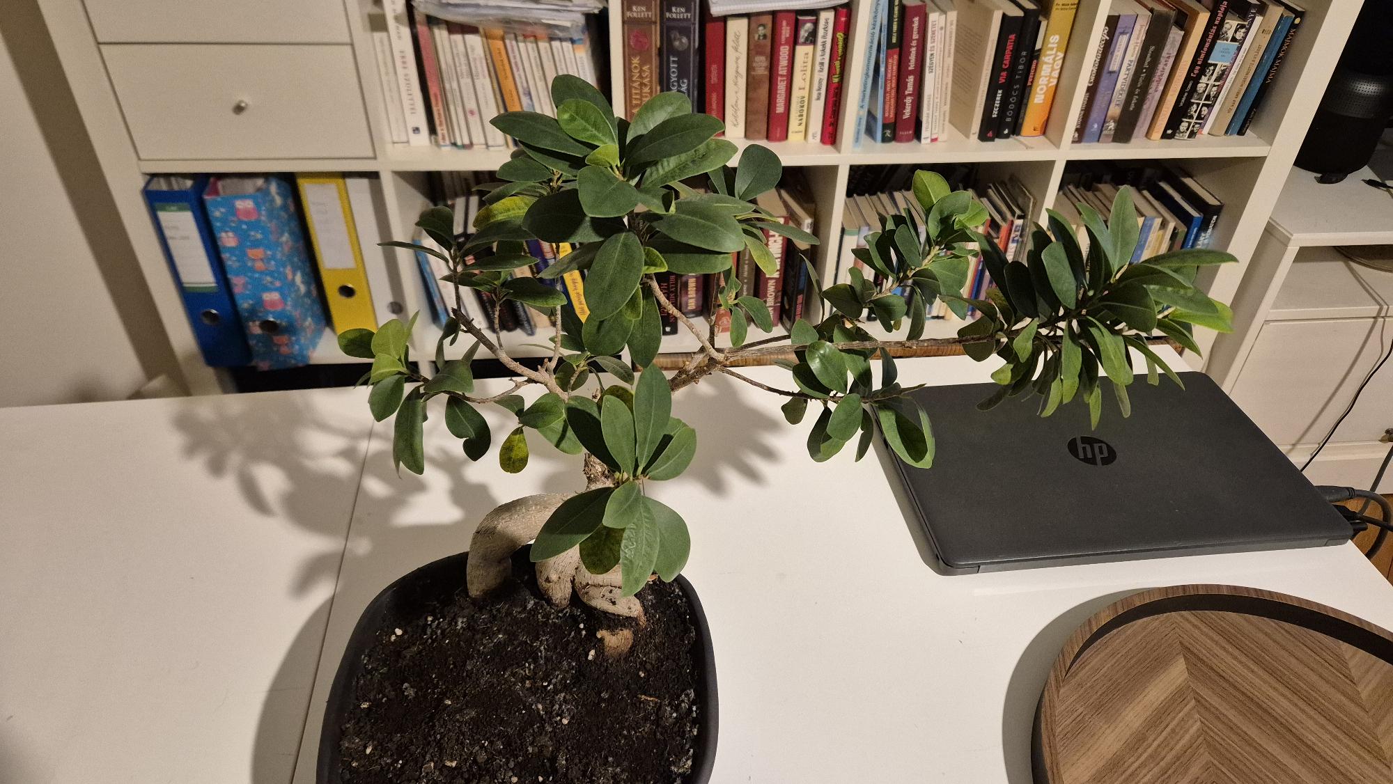 A hajdanán Ficus Microcarpának vásárolt bonsaiom pár év után valószínűleg nem ideális körülmények vagy túlöntözés hatására elpusztult, de egy ágát megmentve tudtam belőle a képeken látható növényt nevelni. Volt amikor egy napos, szinte árnyéktalan teraszon tartottam a 3. emeleten tavasztól őszig és csak a mínusz fokok beálta előtt egy kicsivel vittem be a lakásba.