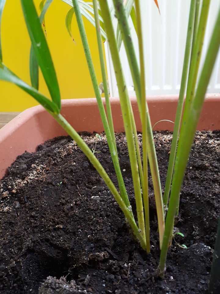 A mi pálmafánk most úgy látom nem igazán élvezte a téli időszakot. Tavaly gyönyörű volt kint az erkélyen (déli fekvésű), de télire bevittük a világos nappaliba, akkor kezdődött a fa leépülése. A képen láthatja a problémát. A növény kapott már pálma tápoldatot is (Agro palmieri)