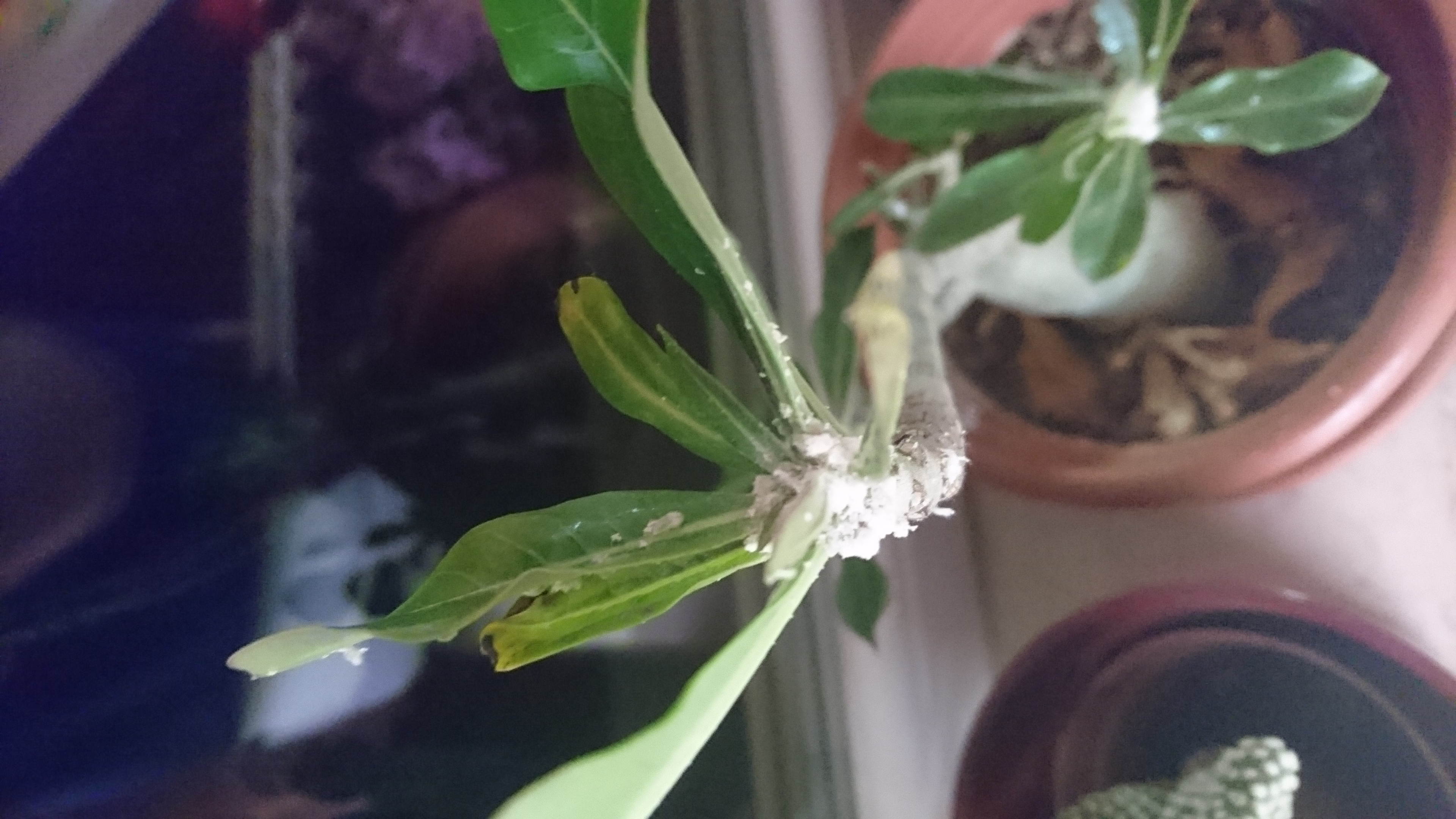 A sivatagi rózsámat megtámadta valami. A levelei tövében fehér penész szerű lerakódások vannak. Ugyan ez a helyzet a gumifámmal.