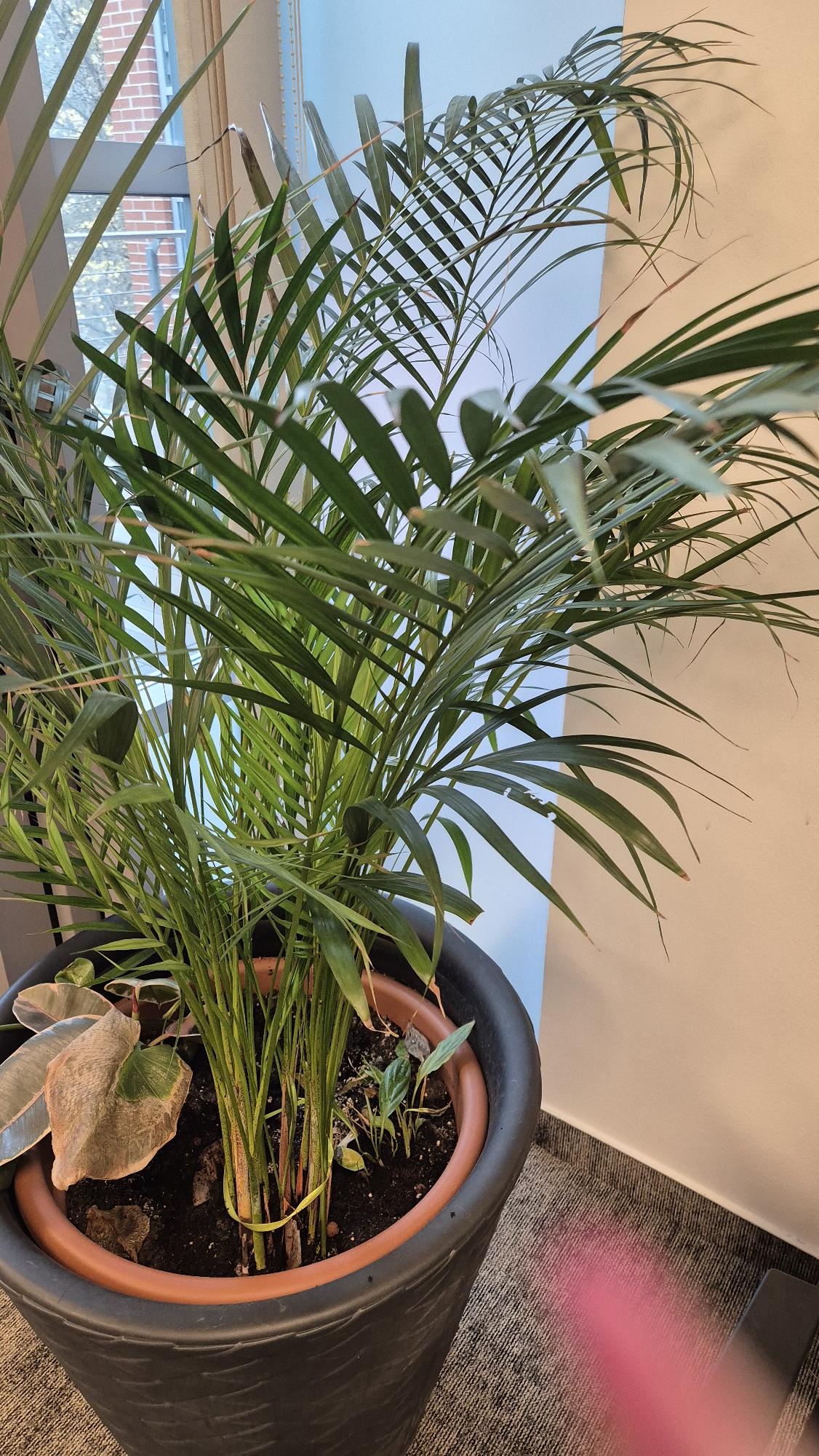 Valószínűleg, hogy a túlöntözés, illetve a nem megfelelő minőségű öntözővíz miatti sófelhalmozódás hatására káliumhiány (K-felvételi zavar) áll háttérben. Ezt mutatja a gyompálma mellé ültetett kis fikusz levele is.