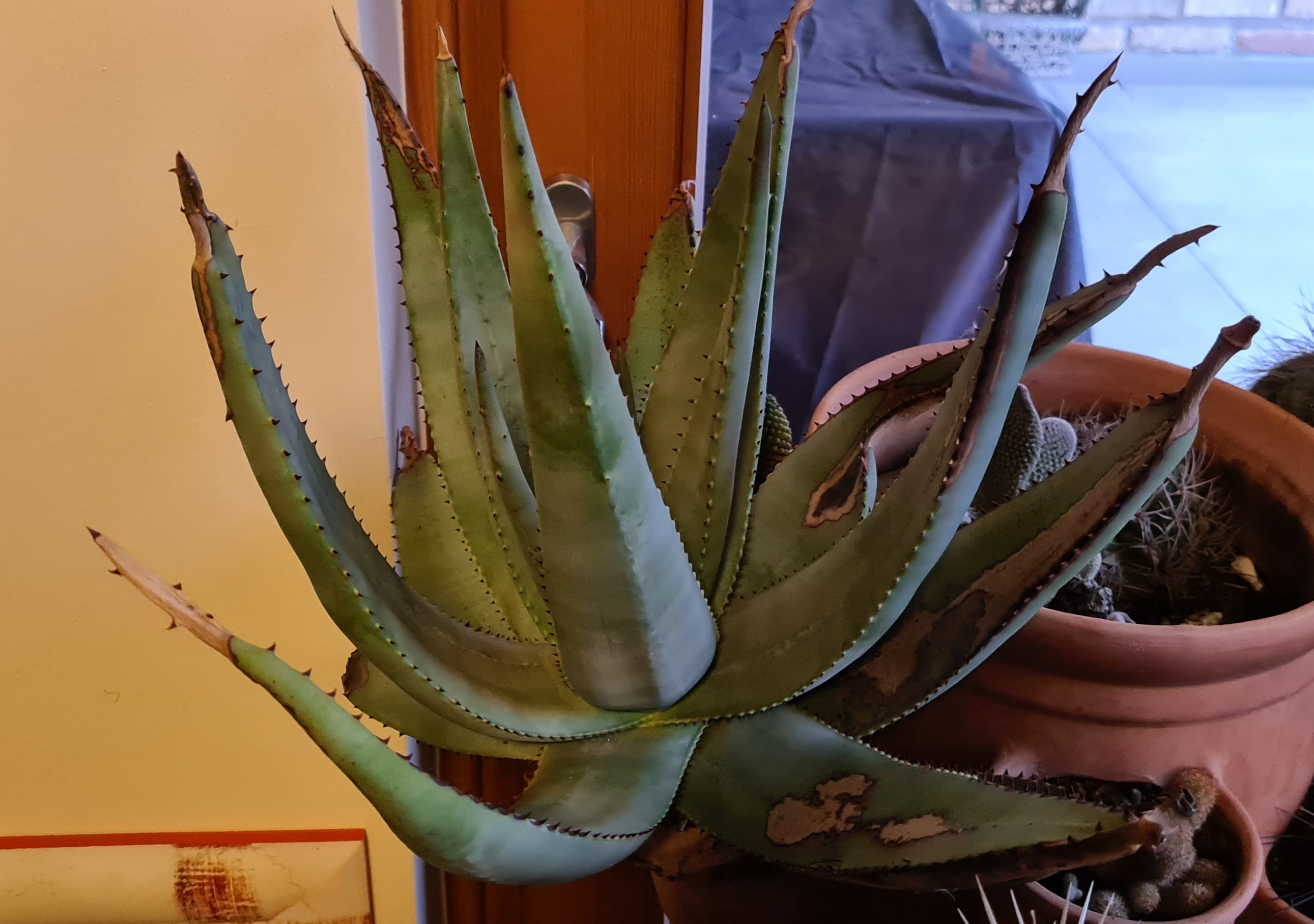 Az egyik agávén barna, fekete színű foltok jelentek meg. Az egyik levél emiatt már majdnem teljesen el is fonnyadt, illetve a többi levél vége is fonnyad. A foltokat először tavaly tavasszal vettem észre a növényen, mivel hirtelen vittem ki a napra napégésre gyanakodtam. Idén ősszel egyre jobban elkezdett terjedni, úgyhogy most gombás fertőzésre gyanakszom. Tavasztól őszig a növény kint van, az eső öntözi+én ha régen esett egy kevés tápoldatos vízzel. Meleg napos helyen van, nyáron a nyövény sokat növekedett is. Télen szobában tartom 18-19°C-on, ilyenkor sosem locsolom.