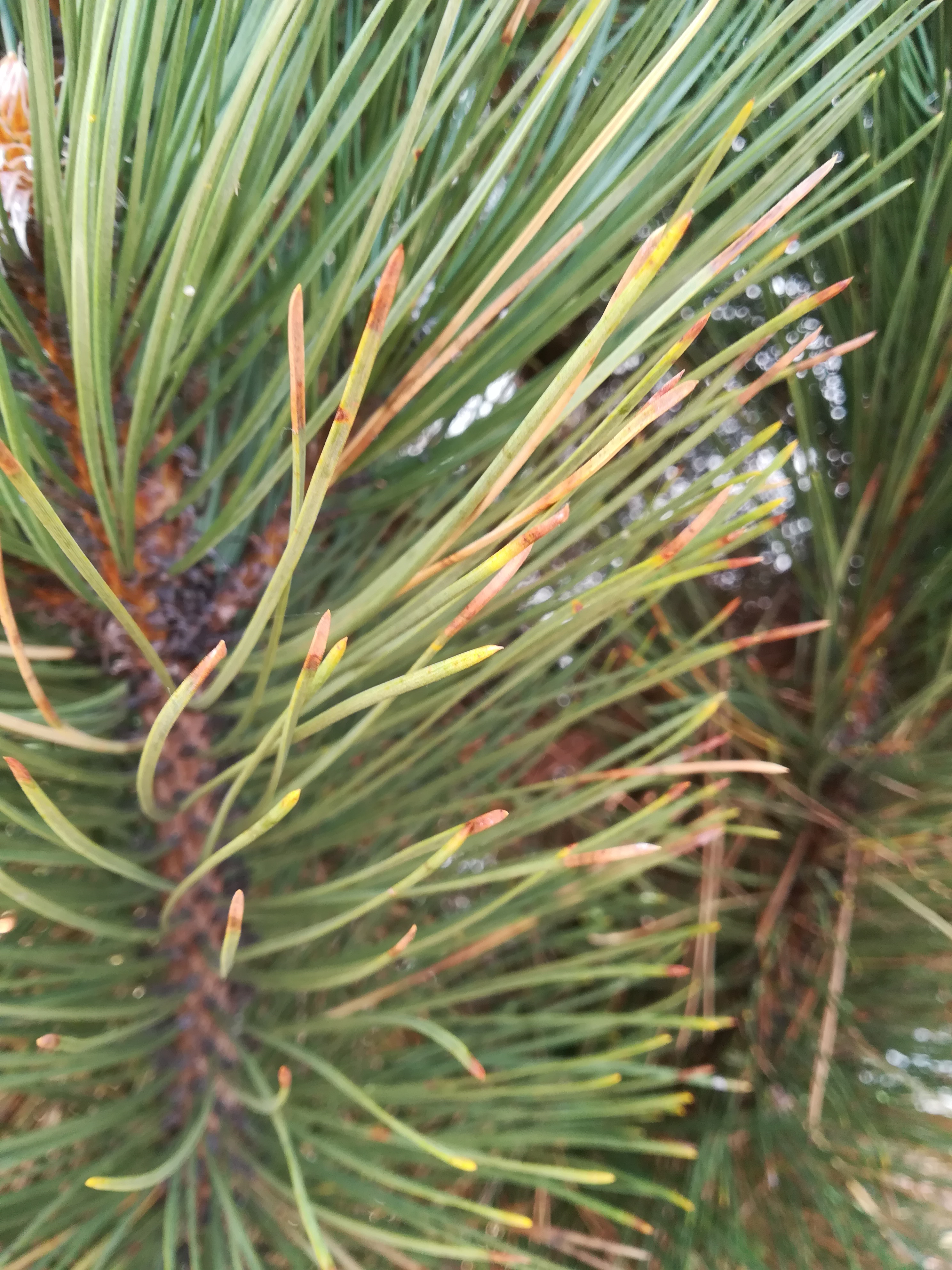 Látszik rajta még tűkarc gomba, és Dothistomás betegség is. A víz ha éri öntözéskor a lombot, az okozhatta. Rezes permetezés+Silwet, vagy Kupfer Fusilan