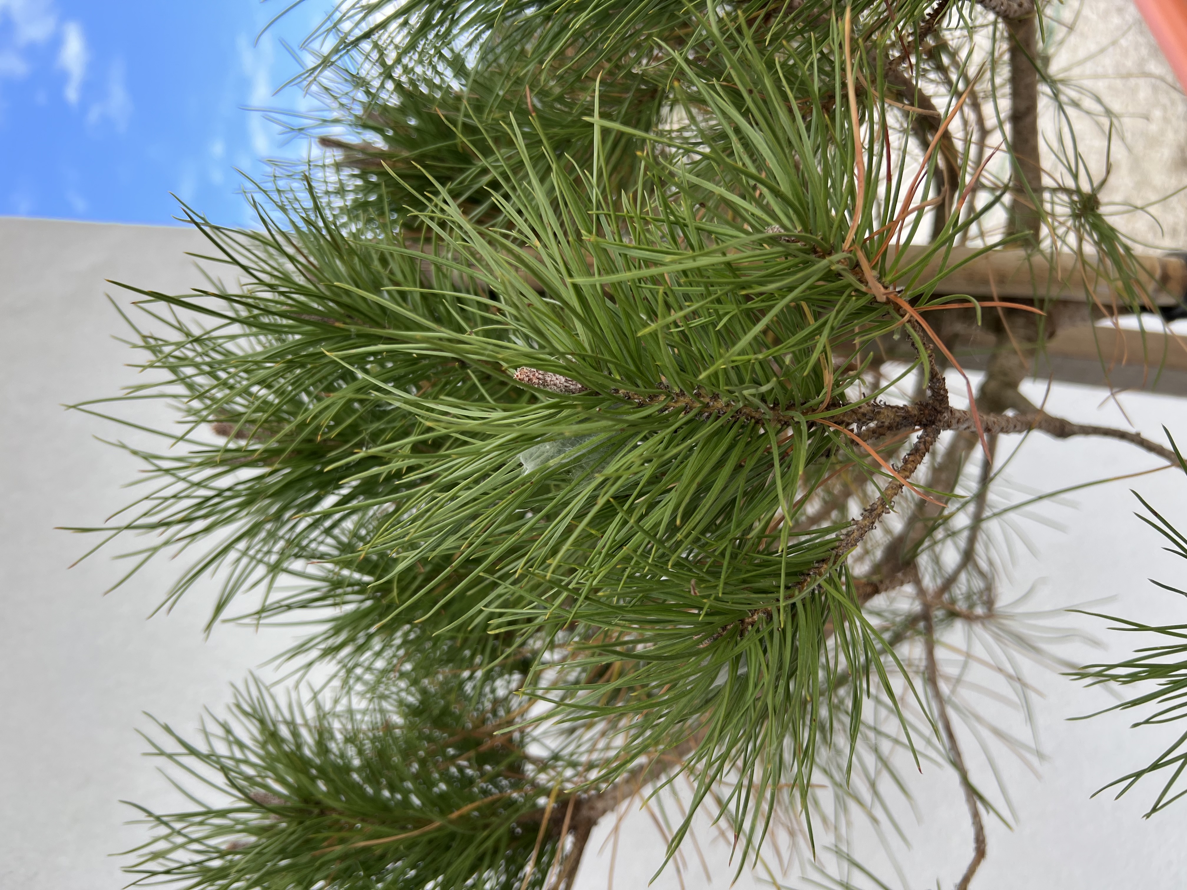 Azért dobja el a régi tűket, mert elfogyott a tápanyag. Osmocote 4-6hónapos. Nitrogén túlsúlyos. Nem szereti a folyamatos locsolást, és kimossuk a tápanyagot. Ritkán sok vizet. Talaj nedvességmérő 3000Ft. A leveleken Dothistroma és a Mycosphaerella pini gomba garázdálkodik. Kupfer fusilan, vagy vmi réztartamú szer. A vízháztartás és a tápanyag gazdálkodást segíti a Zeba. A fehér pamacs az egy pók lesz.