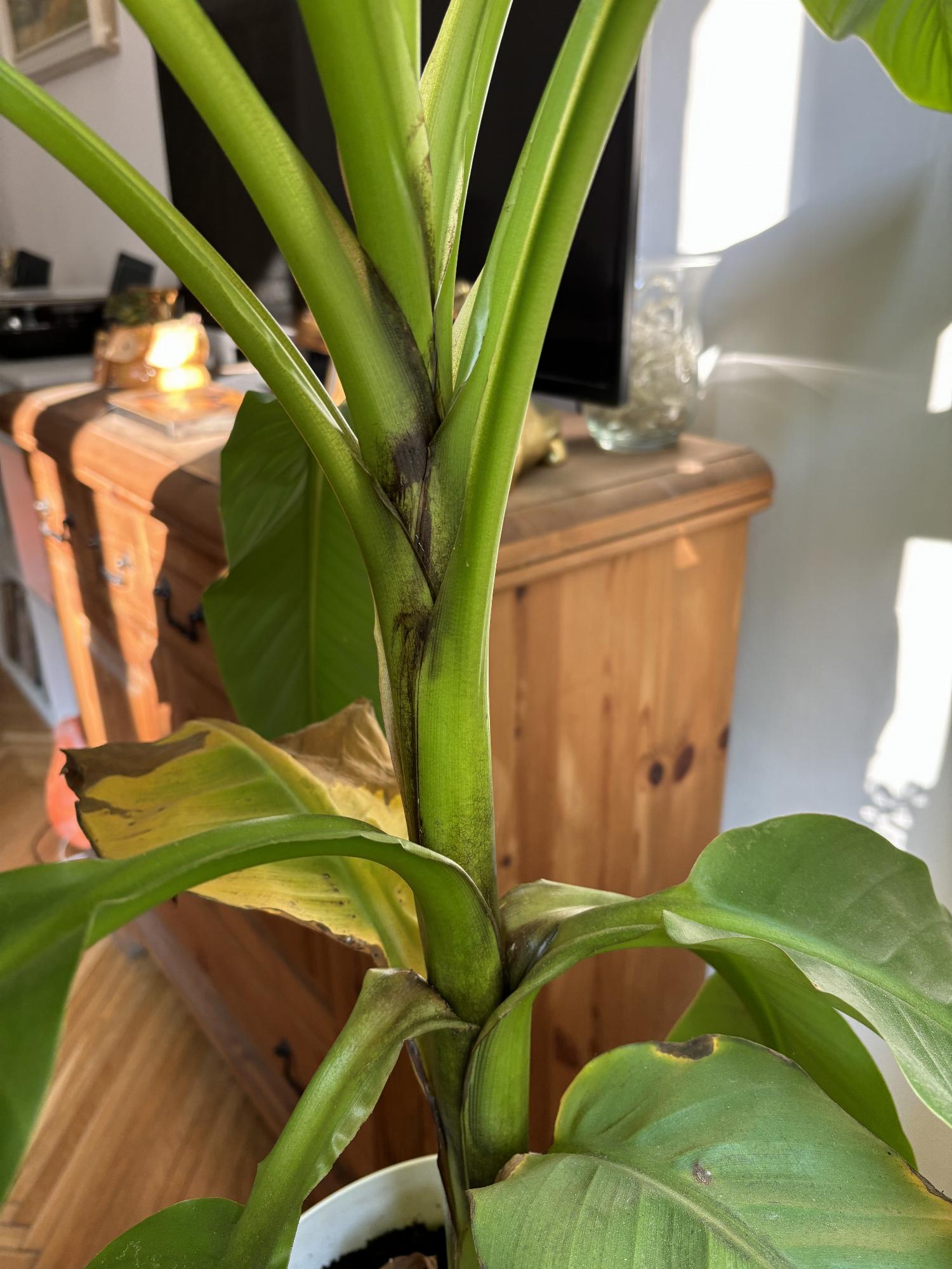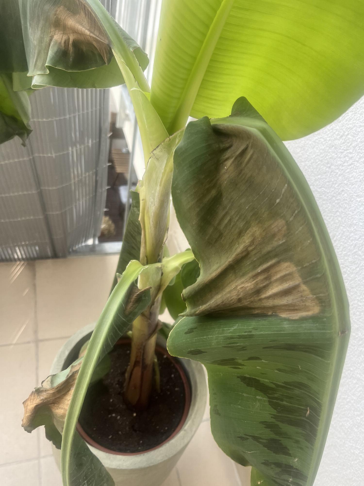 Kedves Szakértő! A banánfánkon (musa basjoo) fekete elszíneződések láthatók, amelyek mostanában (elmúltt 2-3 hétben) alakultak ki. A kb. 1 éves növényt lakáson belül tartjuk. Megközelítőleg heti kétszer locsoljuk. Mi lehet ezeknek a fekete elváltozásoknak az oka? Az egyik képen látszódik, hogy vannak olyan levelek a növény alján, amelyek már eléggé meg vannak hajolva/letörve. Ezeket érdemes eltávolítani? Előre is köszönjük a segítséget!