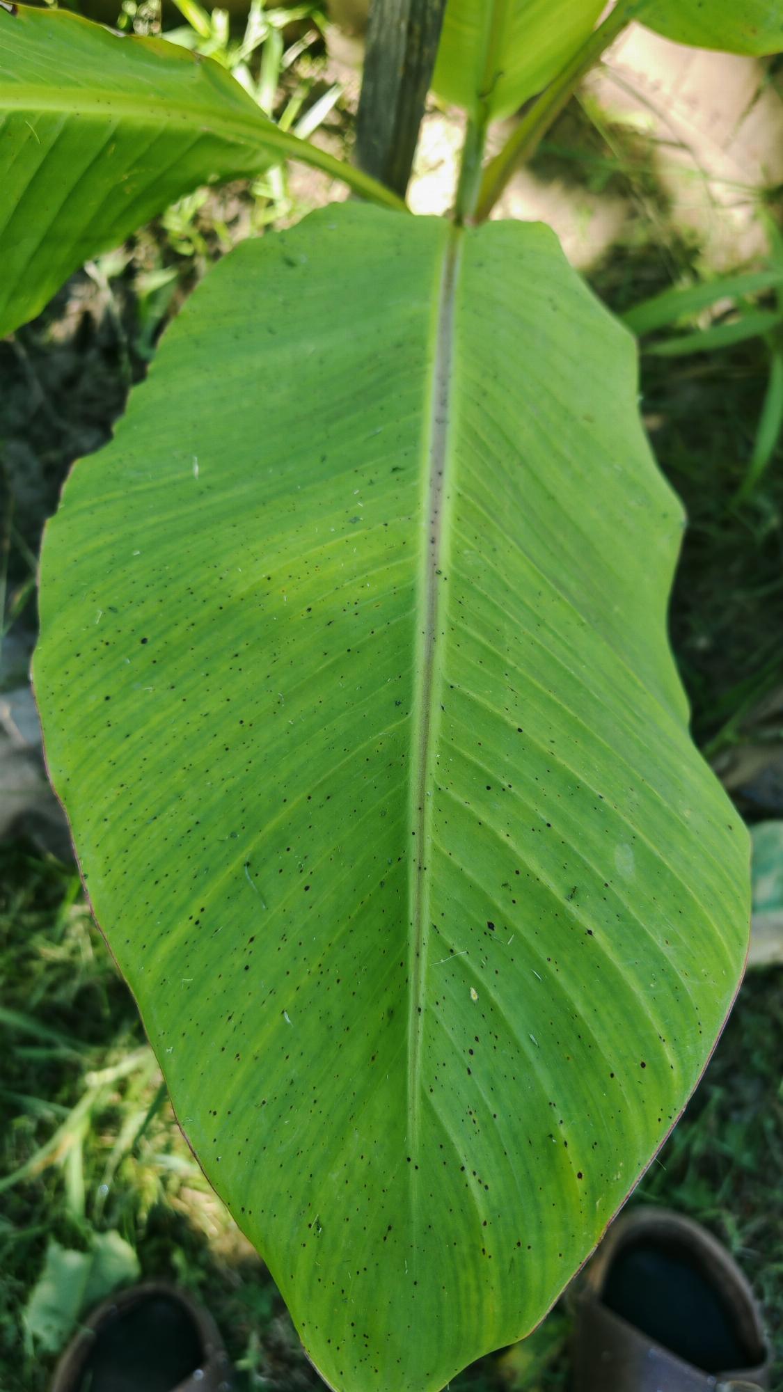 Kb 1 hónapja kiültetett Musa daijo-n a képen látható fekete pettyek jönnek elő. Mi lehet a baja valami gombás fertőzés? Réz szulfát permetezés segítene rajta ? Vagy eselteg más?