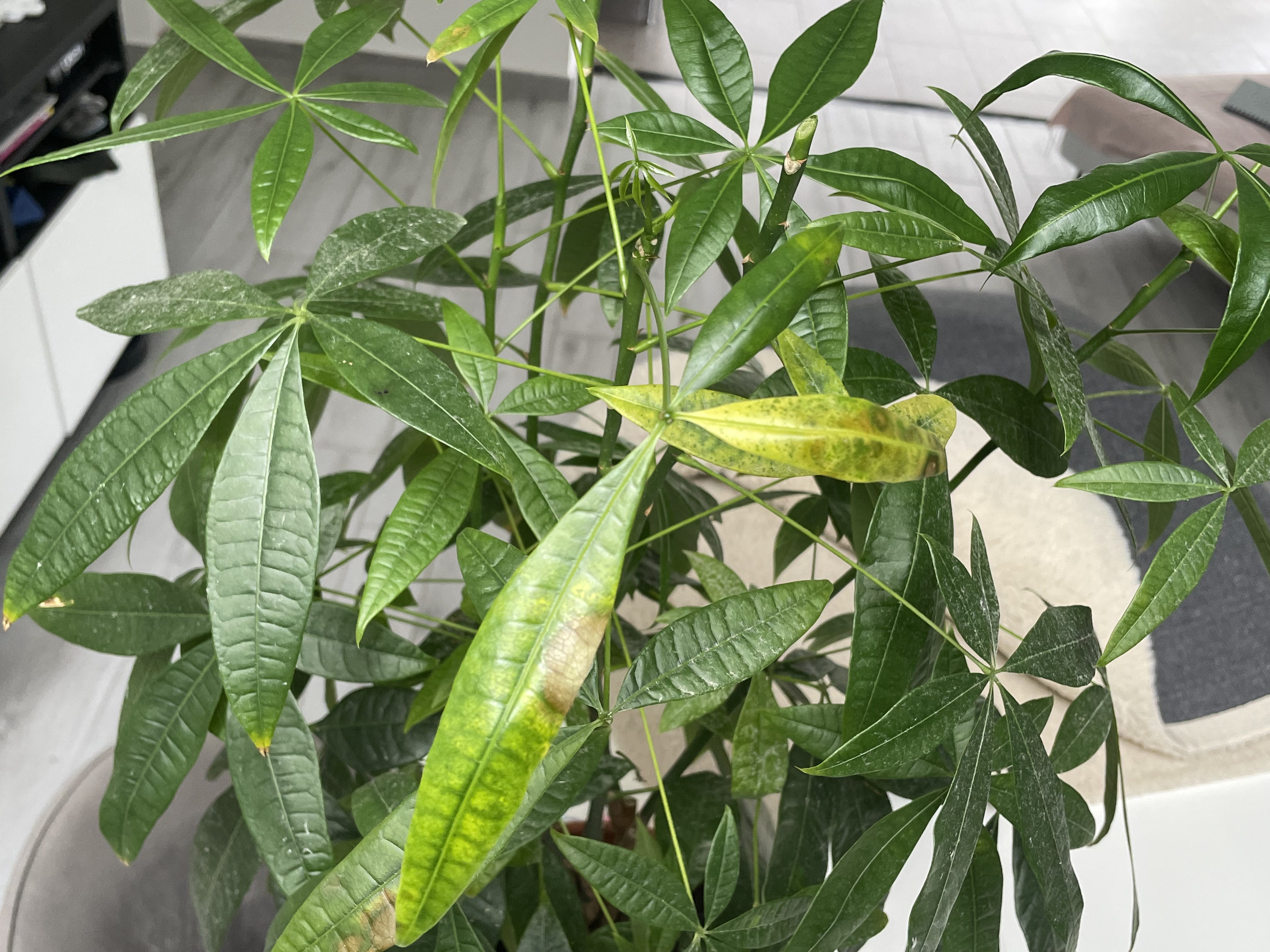 Egy kis segítséget szeretnék kérni. Körülbelül 2 éve van két nagyon szép Vadkakaó pálmám (Pachira). Az elmúlt időszakban nagyon szépen nőtt megduplázta a nagyságát új gyönyörű ágakat leveleket hozott. Pár hete azonban a levelei foltosak lesznek és kifakulnak elsárgulnak majd leesnek. Nem tudom mi lehet a baja. Képeket mellékelek. A válaszukat várom.