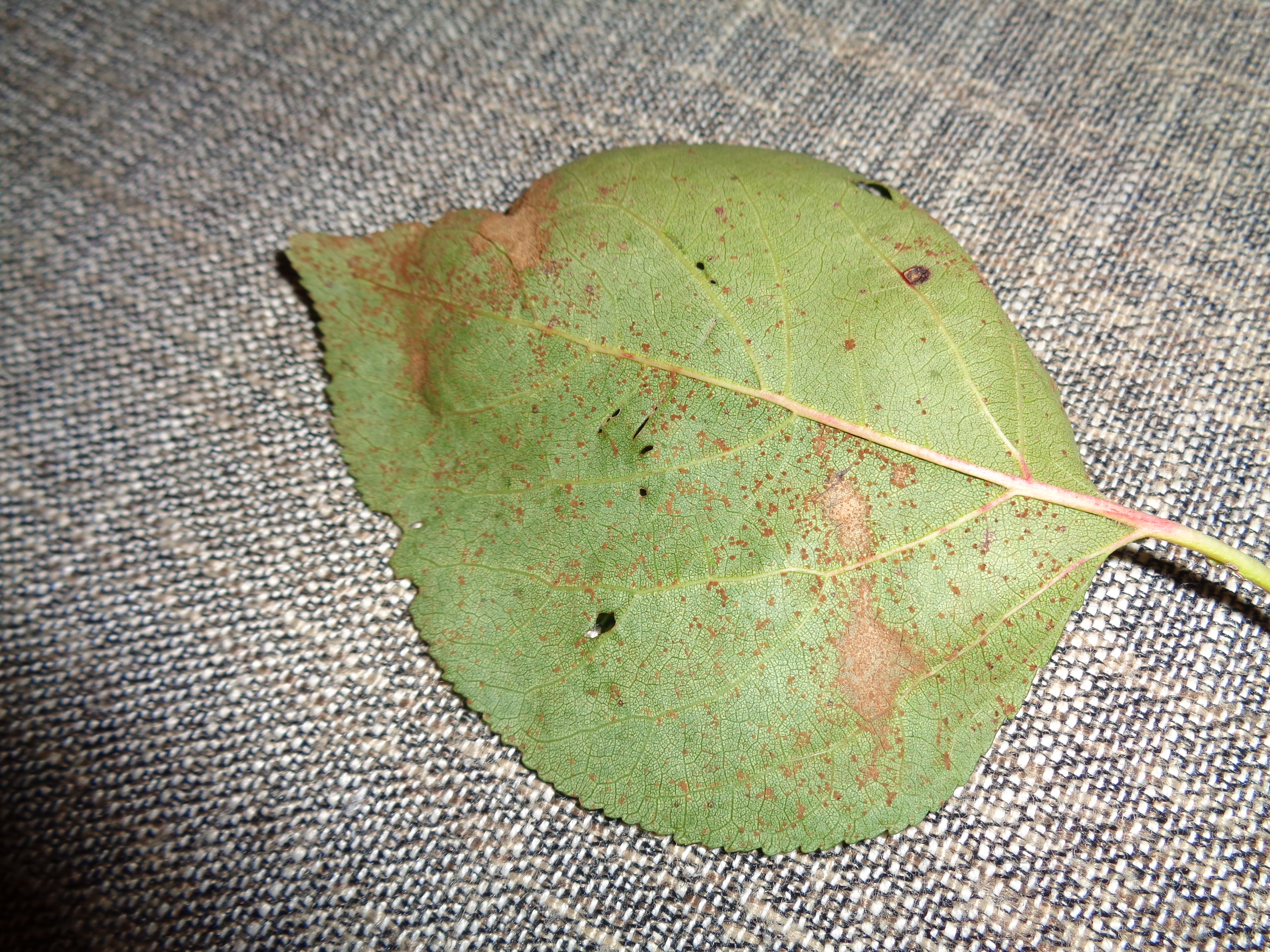 A sárgabarackfám jelenleg teljesen zöld lombjáról hirtelen, sárgulás nélkül hullani kezdtek a levelek. A levelek hátsó oldalán gombaképletek vannak (olyan mintha megszórták volna fahéjjal), ujjammal lesímíthatóak, porszerű anyag marad a bőrömön.