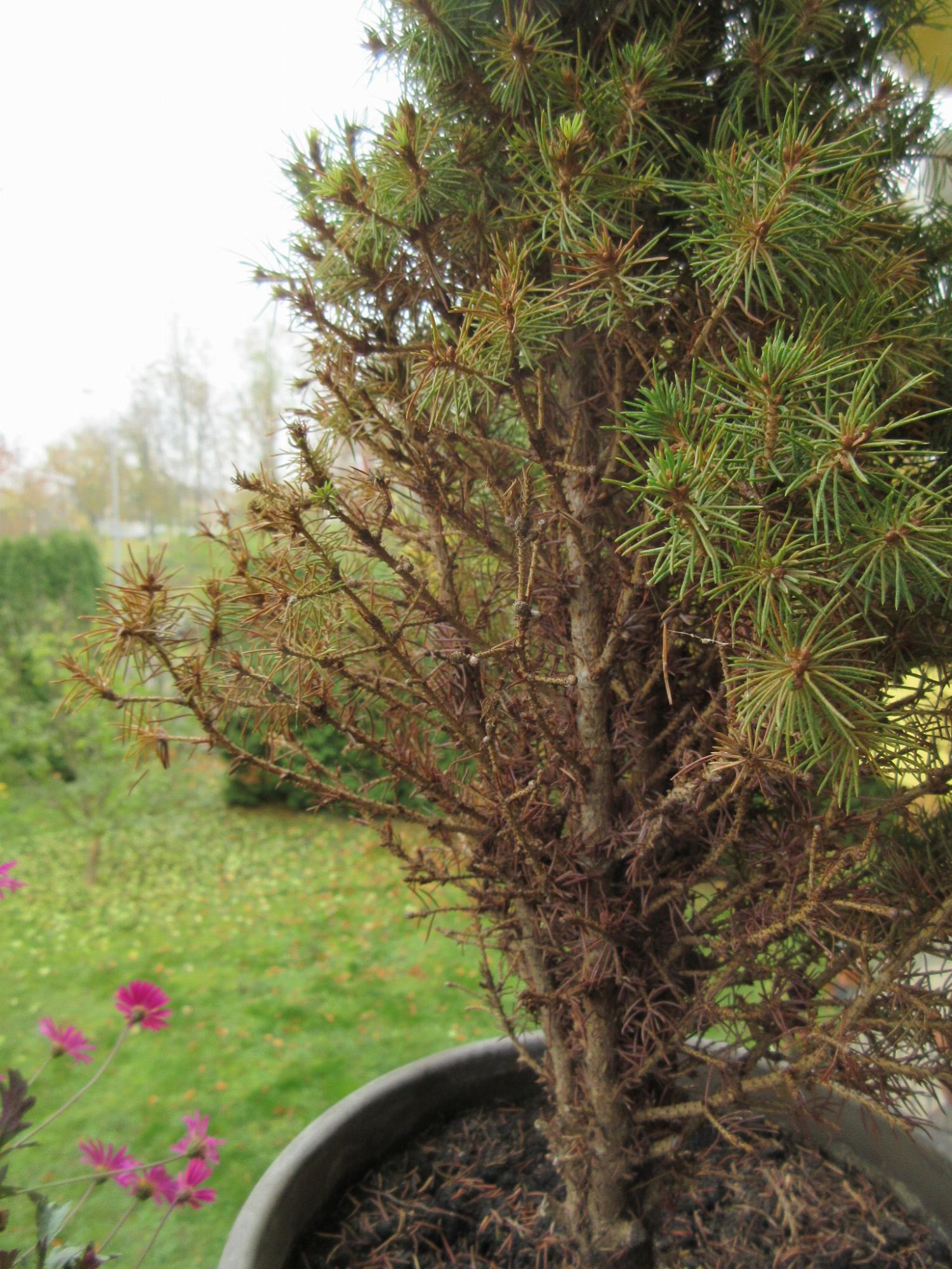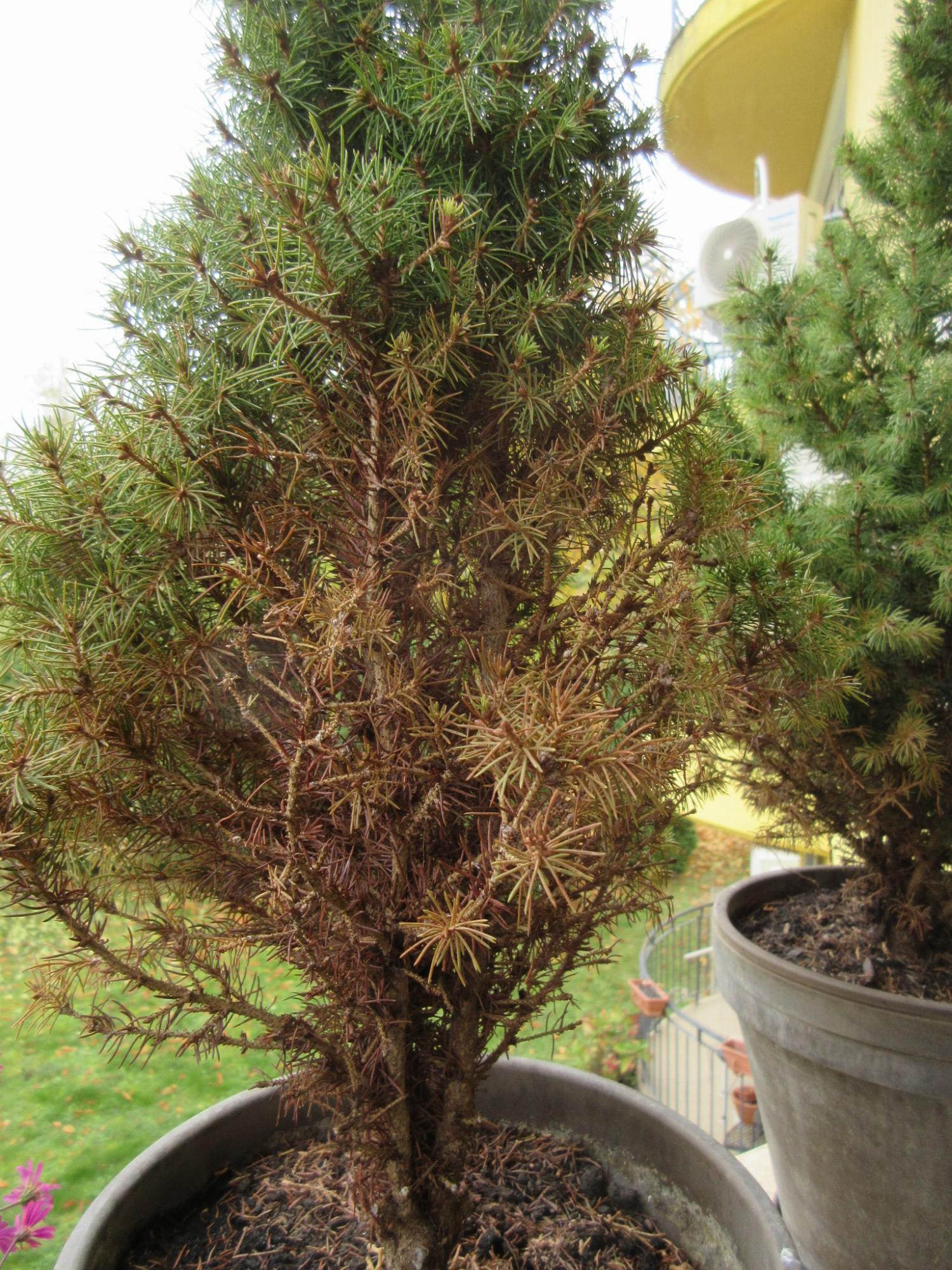 Bár a cukorsüvegfenyőről írják, hogy edényben tartható, de sajnos ez hosszú távon nem igaz. A gyengült növényt megtámadhatja gomba, atka, de a napsütötte oldalon napégés is előfordulhat, illetve tápanyag- és vízfelvételi zavar is lehet az ok, ami a gyenge gyökérzetre utal. A kertben kellett volna hagyni. A növény nem fog helyre jöbbi, féloldalas marad.