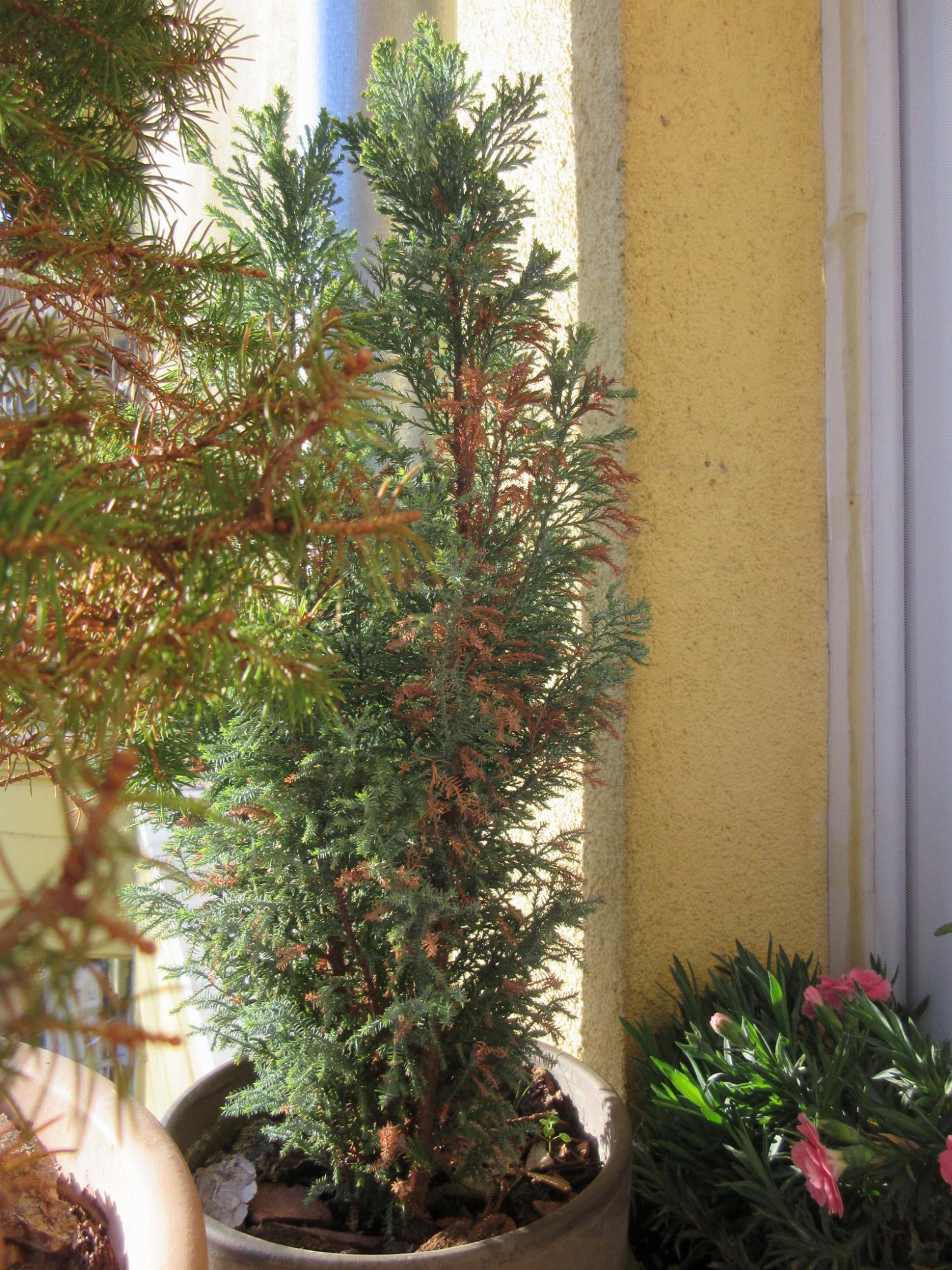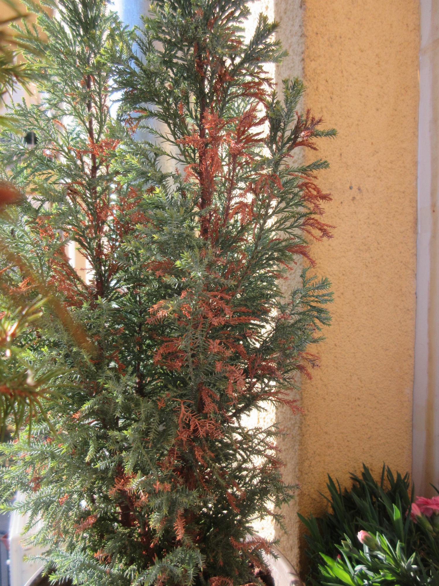 Erkélyen tartok agyagcserépben néhány cukorsüvegfenyőt és idén nyáron elkezdtek csúnyán elbarnulni, nem az egész, csak foltokban, gondolom a nagy szárazság okán. Elvittem aztán őket egy kertbe ahol füves, bokros terület vette körül, attól kicsit erőre kapott. Most visszakerült az erkélyre és ugyan az elszáradt rész megvan, de látszik, hogy elkezdtek apró hajtások kifejlődni a zöld részen. Kérdésem, hogy mit lehet tenni az elszáradt résszel, nyírjam le azokat az ágakat?