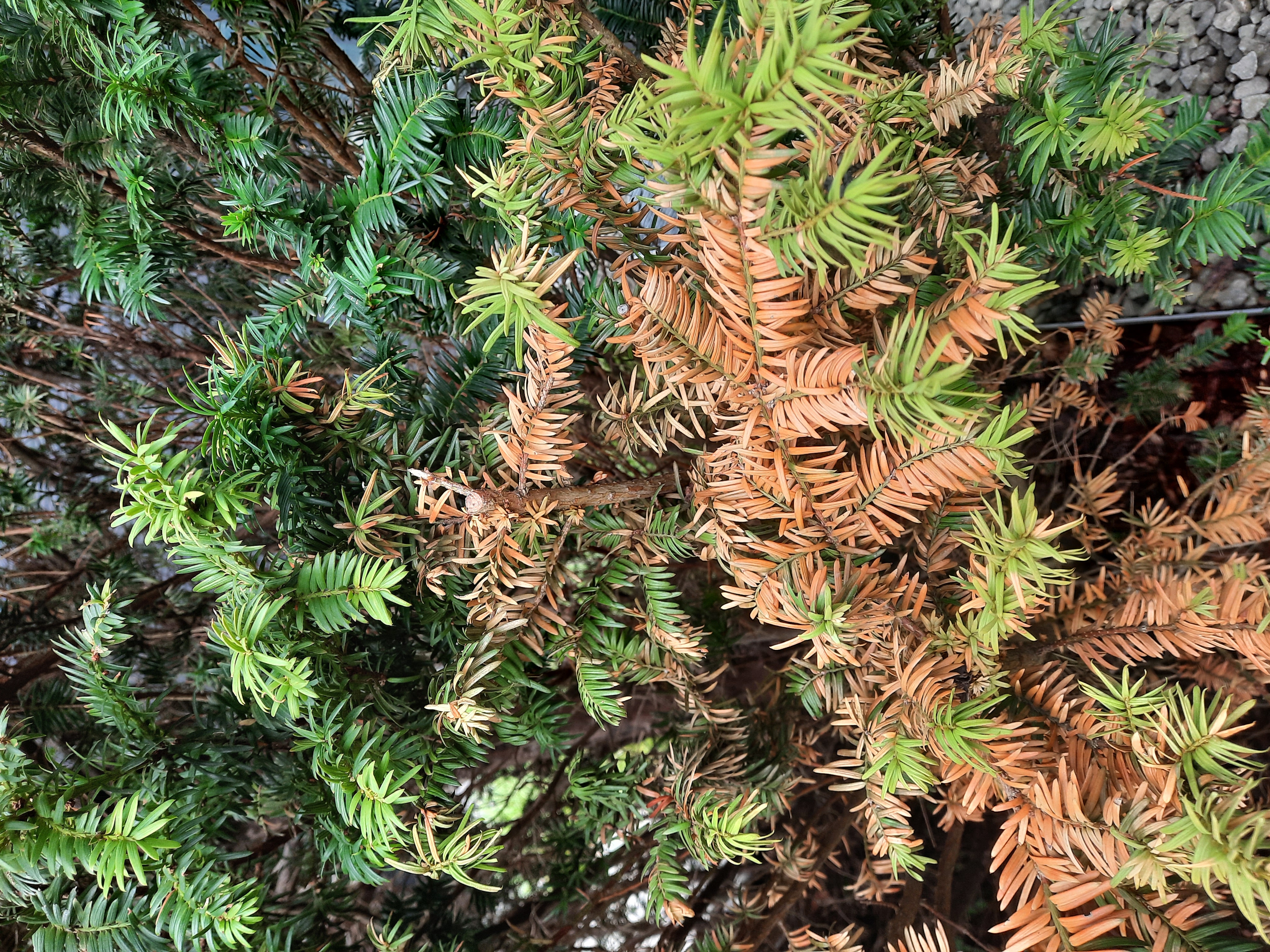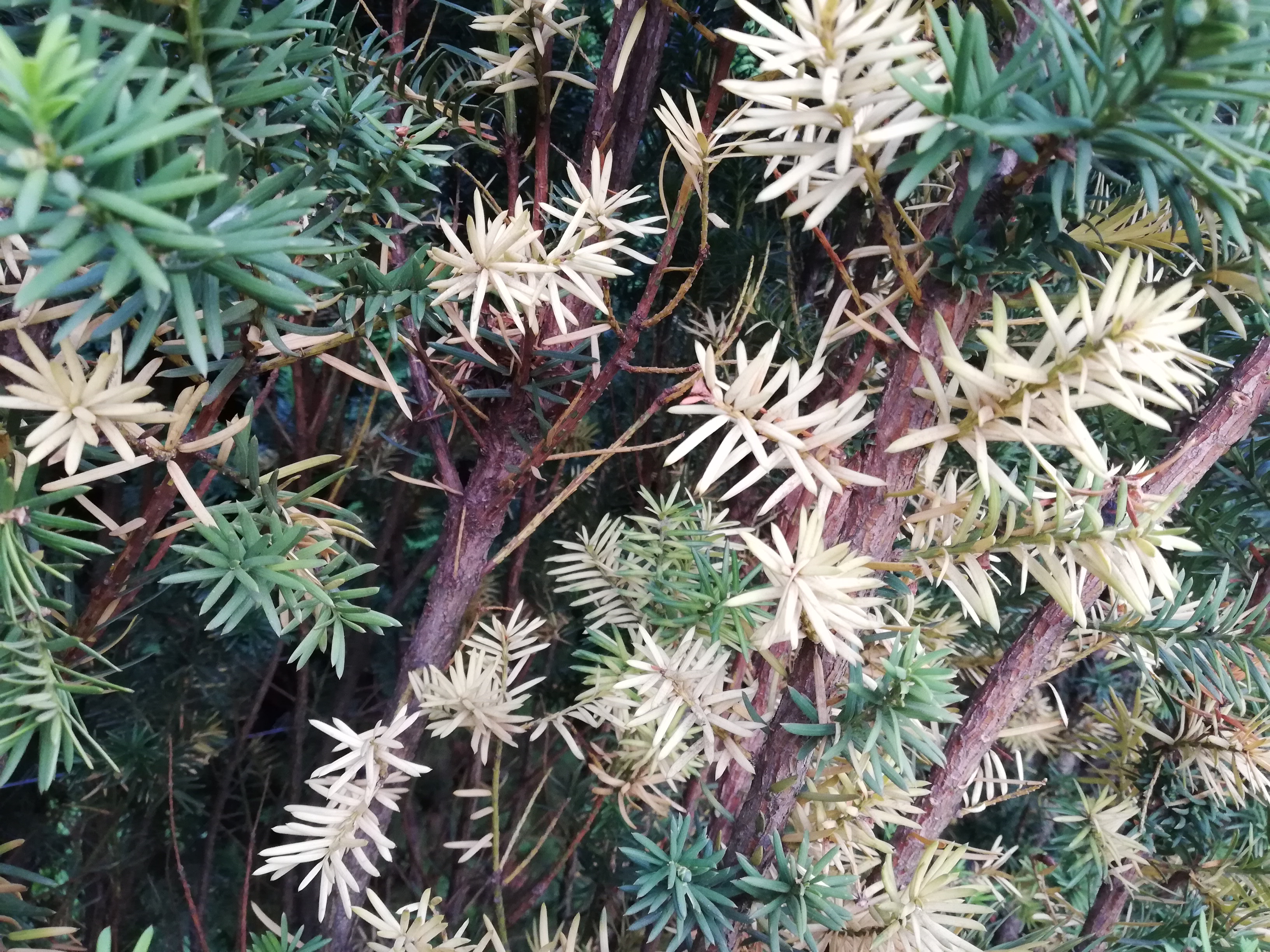 A 20-30 éves tiszafa sövényünk tavasz óta foltokban szárad és kopaszodik. A levelek vége kifehéredik, majd leszárad és kopaszodik. Tavasszal gombaölőszerrel permeteztük, de a folyamat nem állt meg, sőt egyre több területen megjelenik. Segítségüket előre is köszönöm. Üdvözlettel, Bonnyai Ágnes