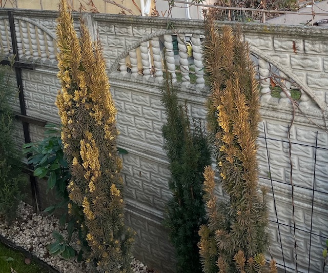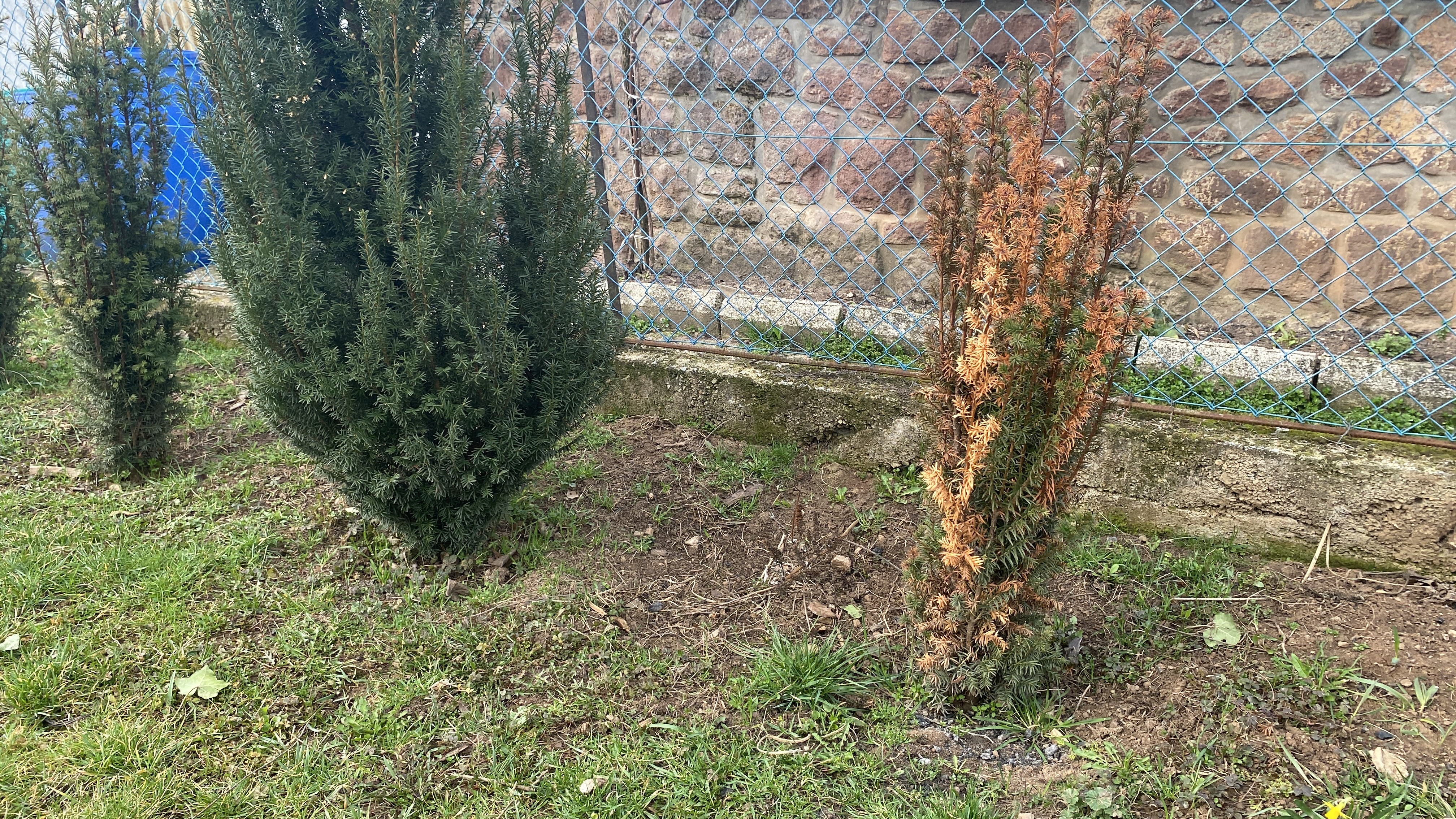 Az ültetést (2023. november) követő tavasszal a 12 db tiszafa közül 5 db barnulni kezdett.