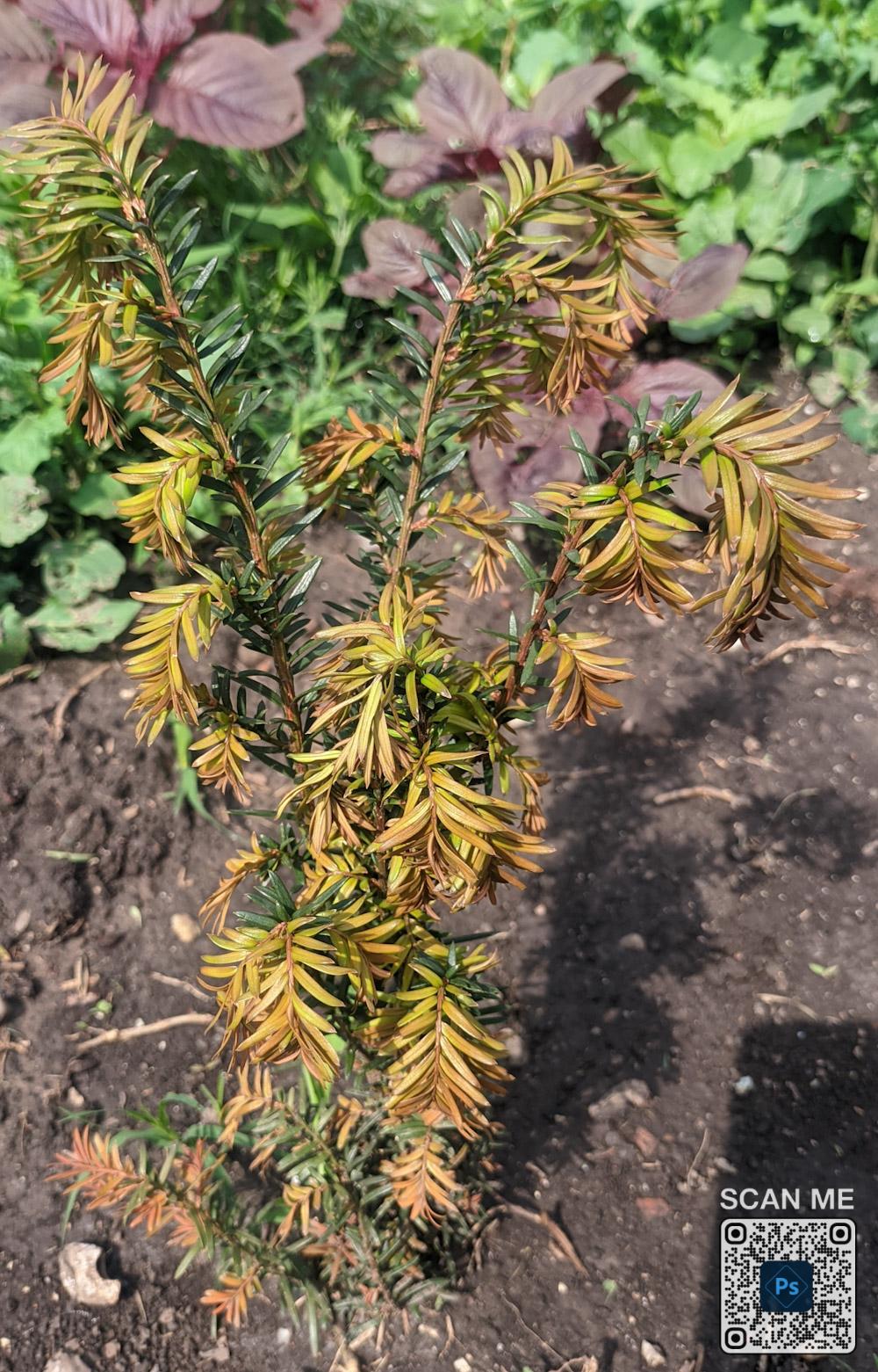 A tiszafa nem szereti a túlöntözést, a pangóvizet. Az okozhat ilyen tüneteket. Illetve a mostani csapadékos, hideg tavasz "előcsalogathatott" egy gyengültségi kórokozót, a Phyllosticta concentrica-t, ami az árnyékoltabb részeken jelenik meg. Az életerős, jól karbantartott, nem túlöntözött és tápanyaggal is ellátott (tartós hatású örökzöld táp) növény kinövi az elváltozást és a betegséget.