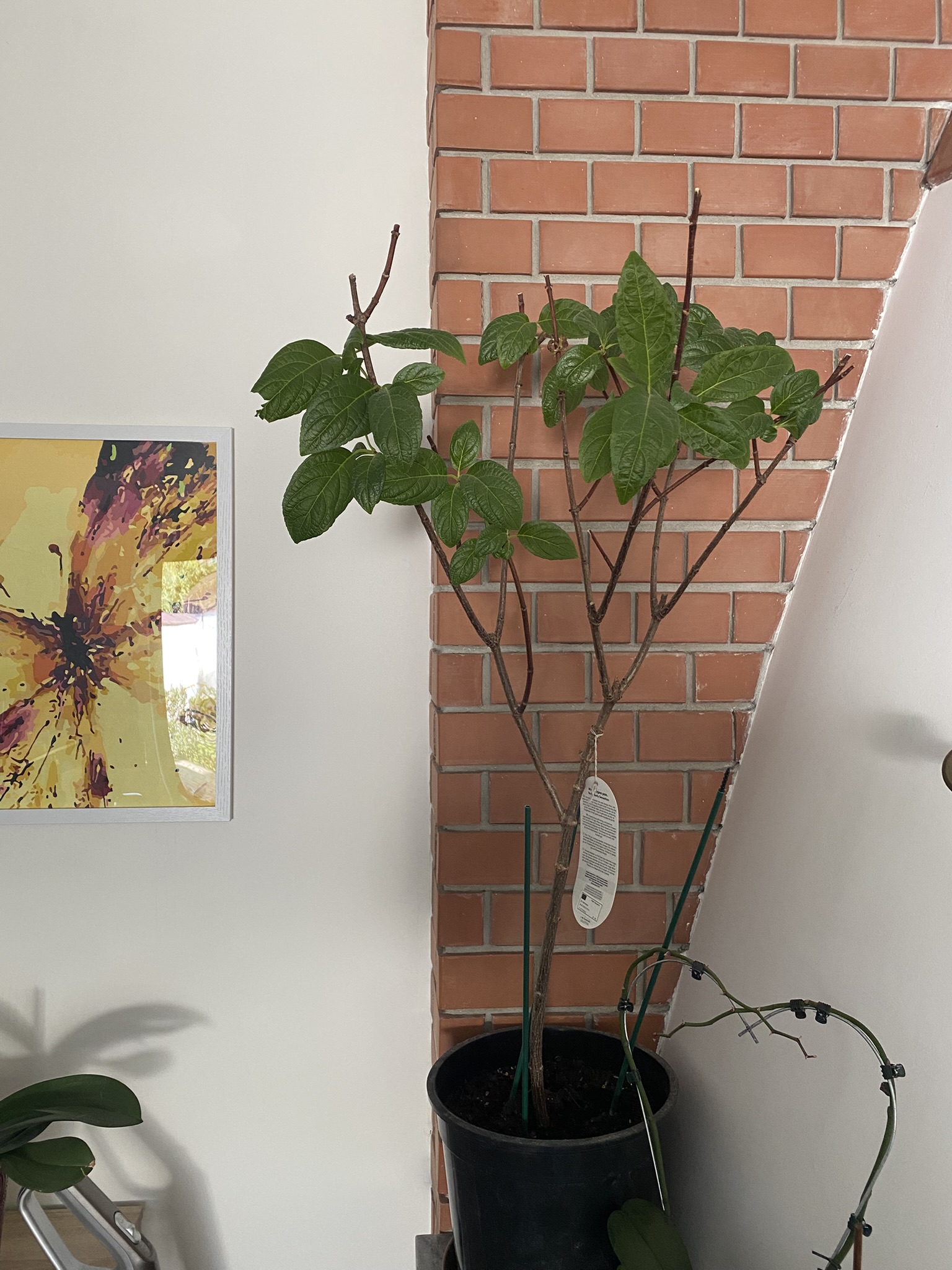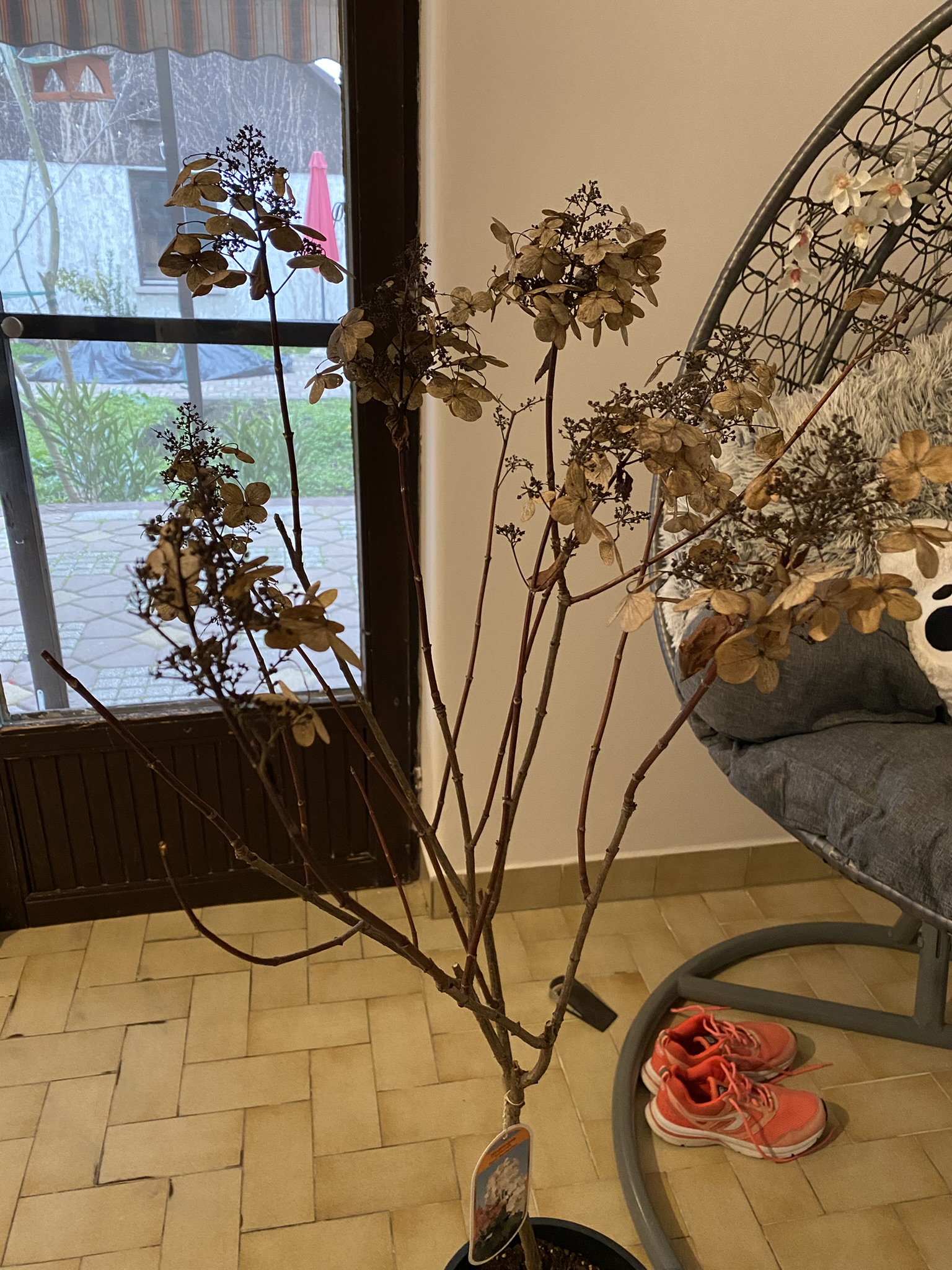 2024. júniusában vásároltam egy nagyon szép bugás hortenziát, amiről sajnos idő hiányában - felújítás - teljesen megfeledkeztem. Alkalomadtán öntöztem, de a cserepében hagytam egészen októberig, amikorra minden levelét eldobta már. Ezt követően bevittem a házba, ahol 24 fokos átlaghőmérséklet van és padlófűtés. A növény láthatóan él, szárai hajlanak, nem törnek, a szárakon, ahol általában ki tud hajtani (nem tudom a nevét) ott zöld színű.