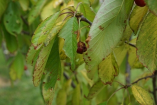 Van egy kb. öt éves Germersdorfi cseresznye fánk. Idén is a lemosópermetezést megkapta. Szépen ki is virágzott. Kb. két hete elkezdett sárgulni a levele és vörös barna foltok jelentek meg a levélen. A kis termések is megbarnultak.