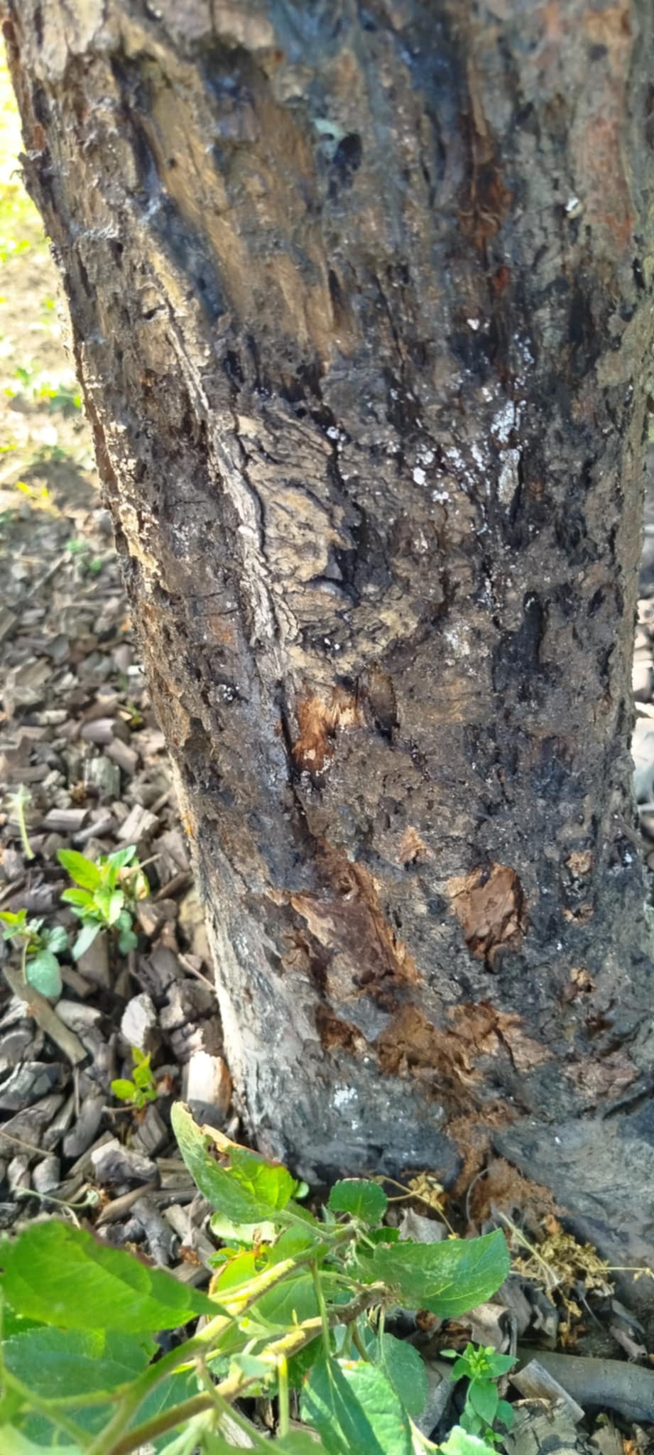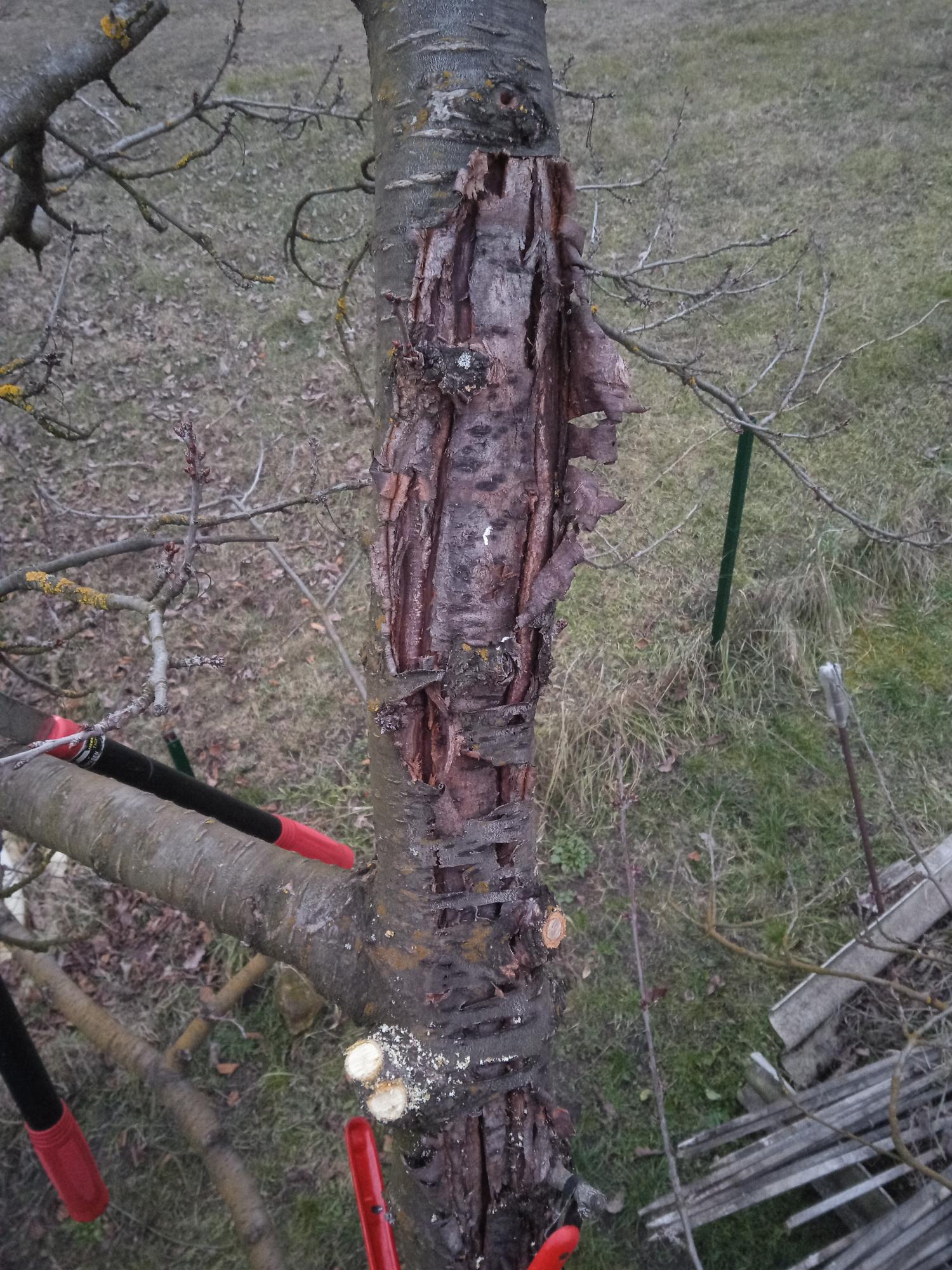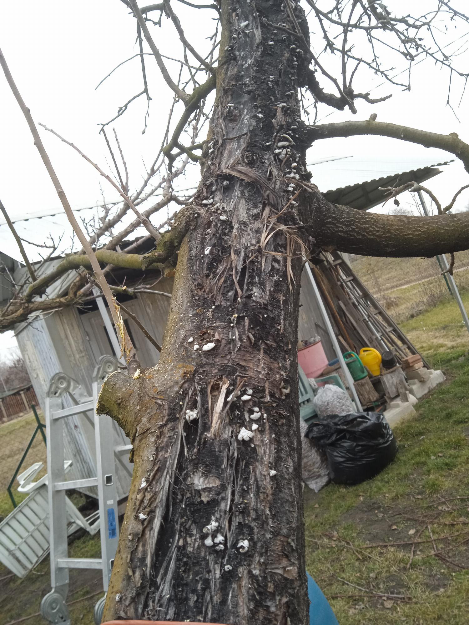 Kedves Sándor. Súlyos kéregbetegség látható, Elképzelhető, hogy anno a metszési felületek nem lettek rendesen lekezelve, lezárva, és a gombák bejutatottak, majd úgy tűnik, hogy farontó bogarak, lepkehernyók is beköltöztek a sérült kéreg alá. A kérget le kell kaparni egészséges részig, és a réztartamú gombaölő szerből készült péppel bekenni, körbekötözni gézzel. Ha a kéreg a törzs teljes keresztmetszetén sérült, akkor nincs segítség.