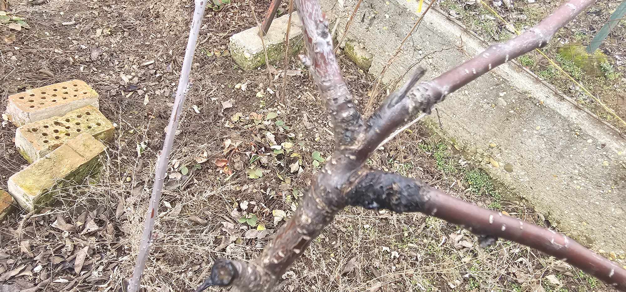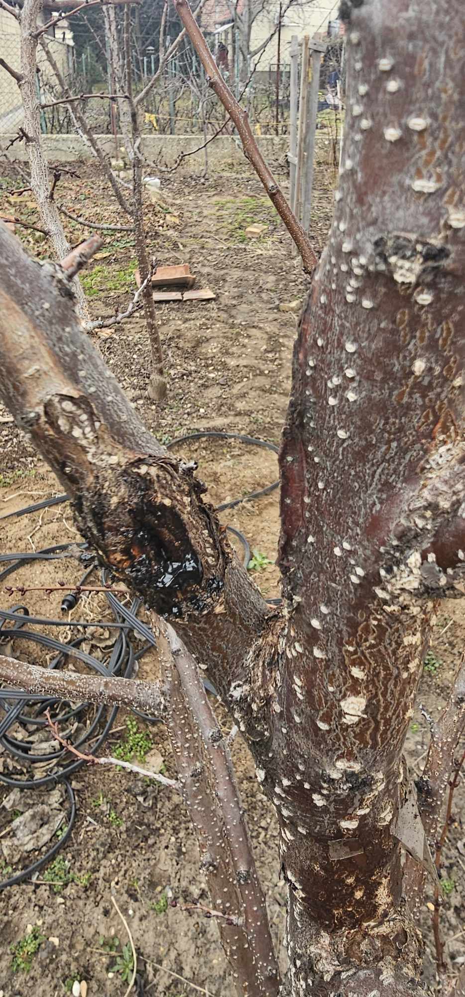 A második képen látható - a fiatal hajtást átölelő sebzés - kevésbé megnyugtató. Más fapusztító gomba is lehet mindkét sebzés, nemcsak a monília. Ha a fa formája nem sínyli meg, érdemes volna visszavágni a törzsig. Ha ezt a módot nem választja, bordóilével kenje be a sebek felületét, jól szellőző anyaggal kösse át és hagyja rajta néhány hétig. A kezelést ismételje meg! Lemosó permetezések mindig rezesek legyenek /pl.bordóilé/. Ha mégis úgy dönt, hogy visszavágja, a vágási felületről küldjön képet.