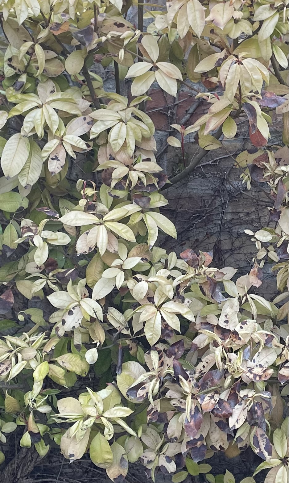 Madárberkenye szintén több van, ami sárgul eltérő mértékben, van ami már tönkrement, illetve vadszőlőből is vannak élettelen tövek. A babérmeggyeken nem annyira látszik sárgulás.
