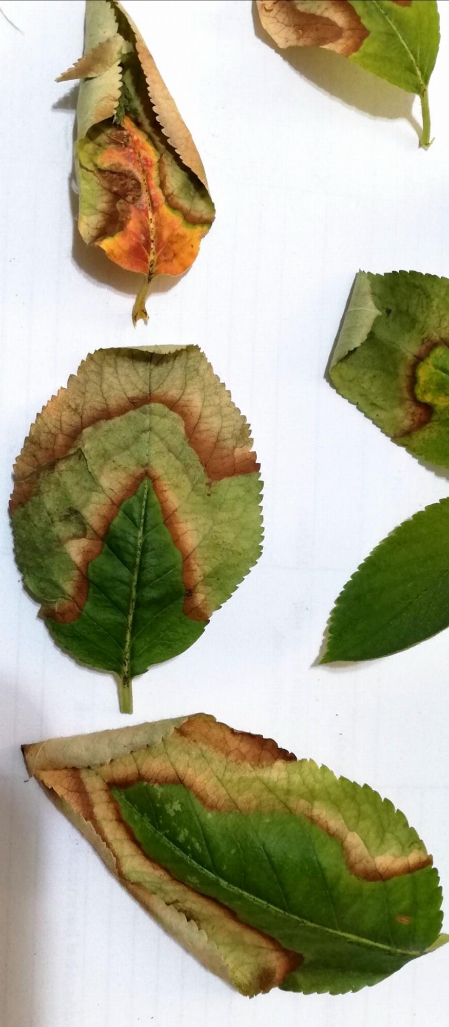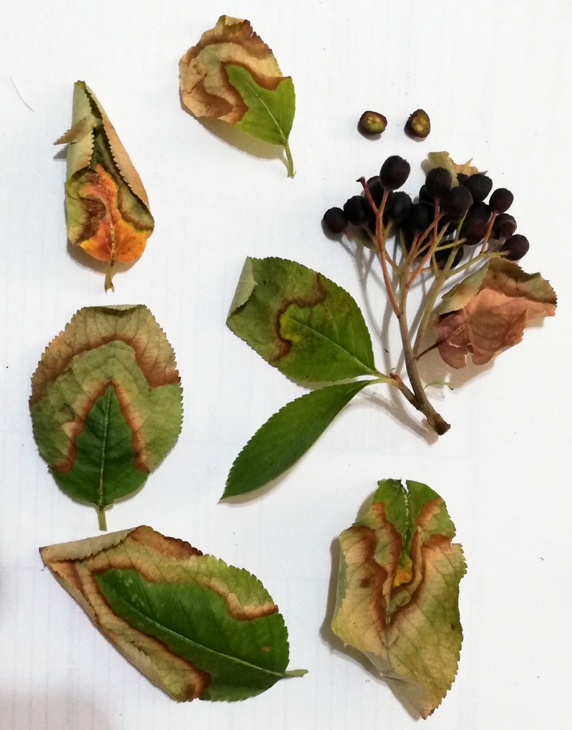 A tavaszi ígéretes indulás után a nyár folyamán a berkenyebokor levelein a fotókon látható foltok és elhalás jelentkezett, a teljes termés sötét színű lett, de nem érett, hanem összeaszalódott. A leveleket látva káliumhiányra gyanakodtam, 1 alkalommal permeteztem is káliummal, de semmi javulás, tovább tart a levelek tömeges elhalása.