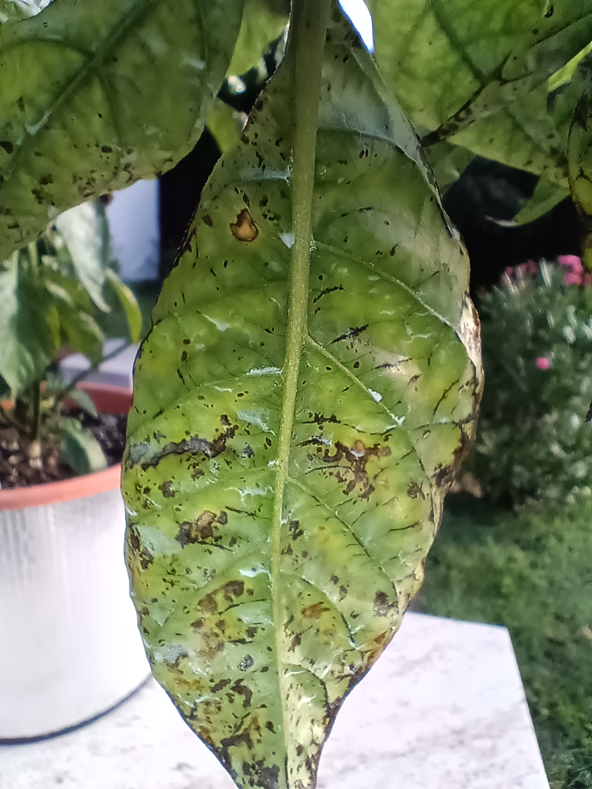 A chili levelén a foltosodást nem gomba és nem is baktérium okozza. A tartási körülmények ismeretében tudnánk többet. A víz- és tápanyag-adagolás egyéb tényezők figyelembevételével megközelítheti az optimálisat. Perzselés a legvalószínűbb, amely a Cuproxat használatából adódhat. A szer dózisa is jelentős lehet 1 liter permetléhez max. 5 ml szer szükséges. A hetenként adott rézszulfát hatóanyag is károsíthat = rézmérgezés, mely a foltosodáson kívül a levelek hullását is okozza. A még zöld színű részek sárgulása viszont kevés nitrogénpótlásra utalnak. A paprika nitrogén igénye nagyon magas.