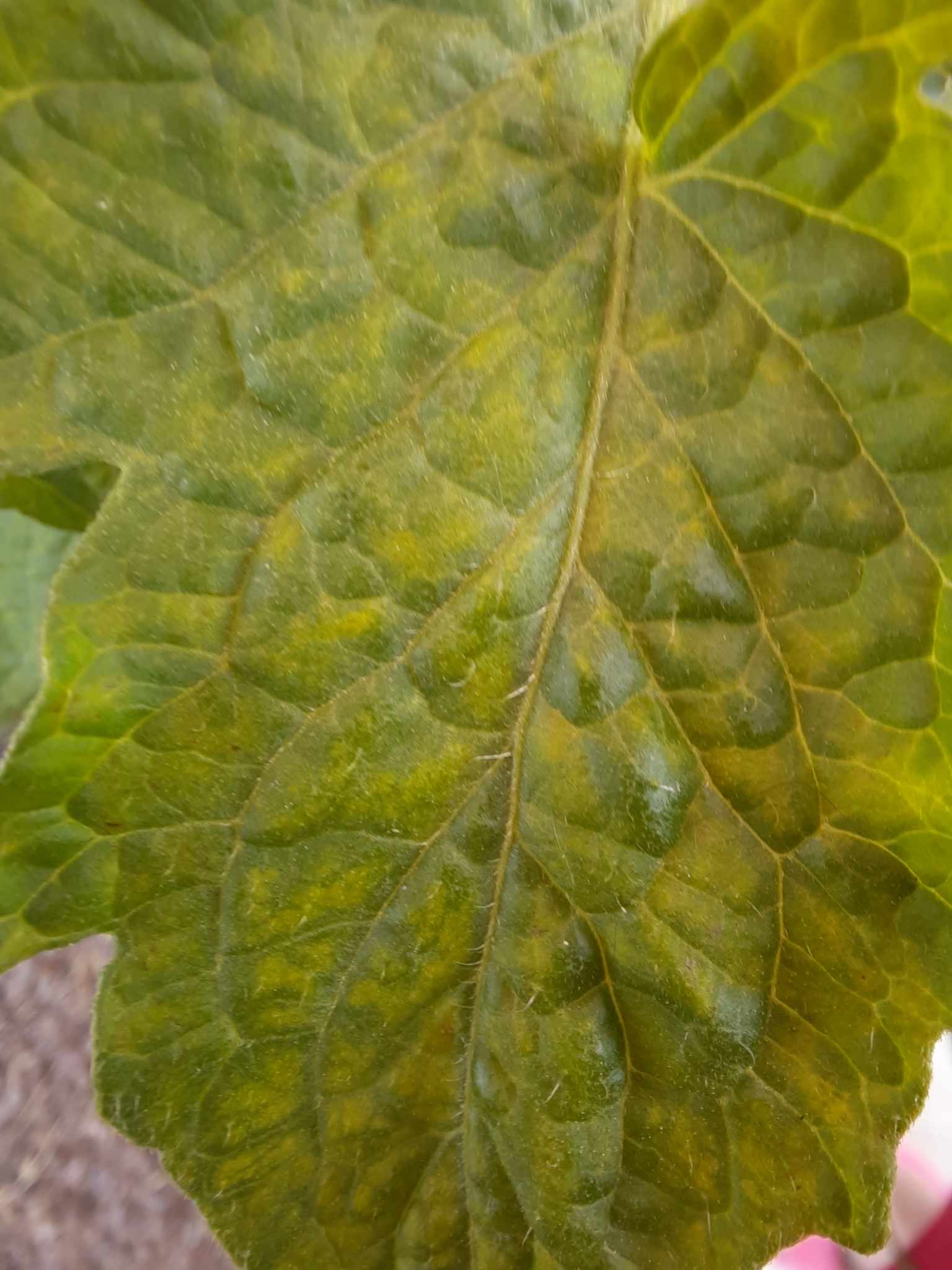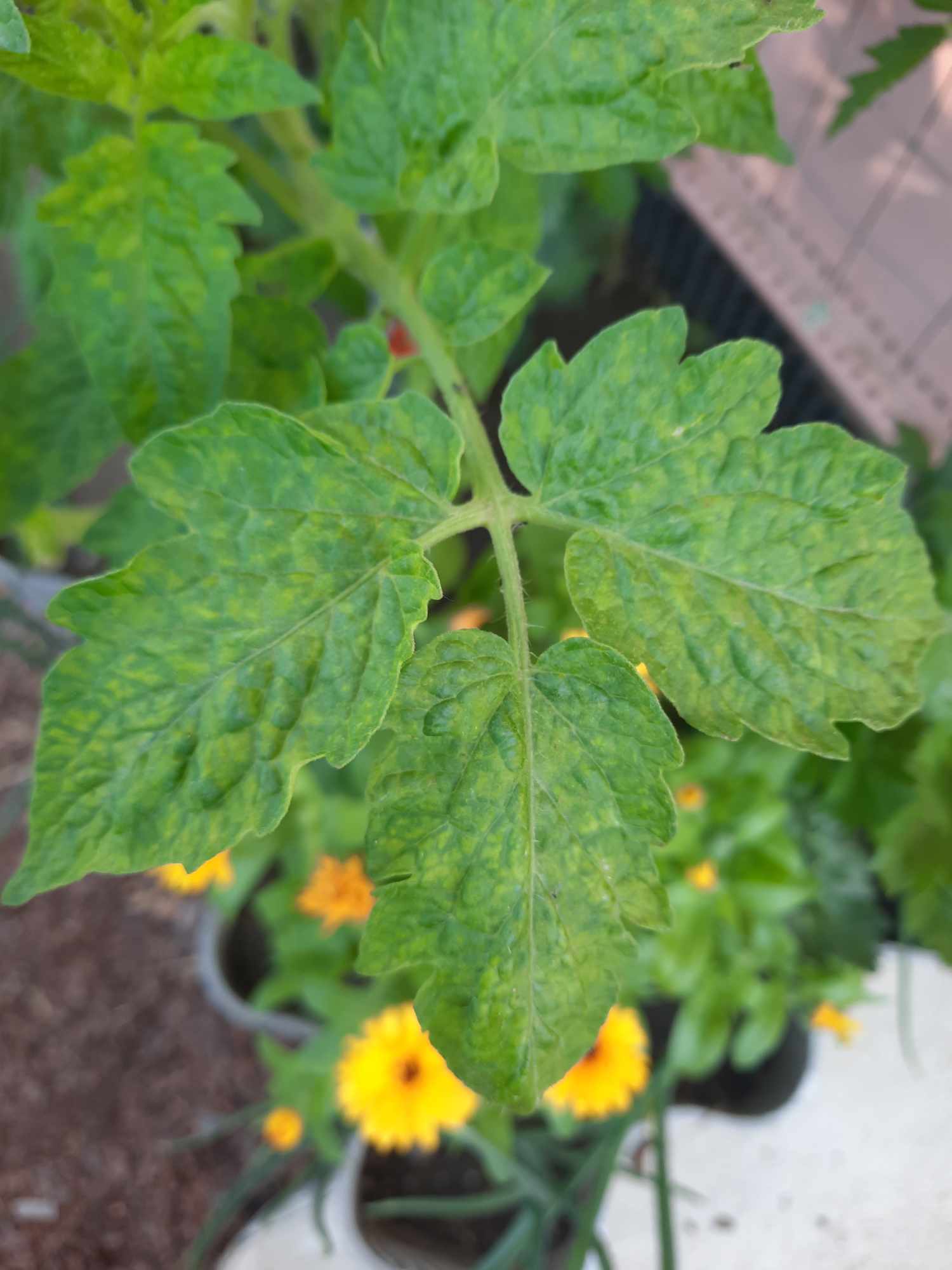 A paradicsomon tápanyaghiány tünetei látszanak, itt oka lehet hogy a talajban nincs elég tápanyag a növény számára vagy valami oknál fogva nem tudja felvenni. Az érközökben látható sárgás elszíneződés leginkább magnézium hiányára utal. Célszerű lehet tápoldattal, illetve lombtrágyázással segíteni a növényen. Egyrészt kifejezetten magnézium túlsúlyos készítménnyel a magnéziumhiányt kezelni, valamint általános komplex tápoldattal a növény általános egészségi állapotát javítani. A lombtrágya esetében a növény hamarabb jut az éltető elemekhez viszont nagyobb is a lemosódó, elsodródó veszteség. A tápoldatozás segítségével feltölthetjük a talajt, ezzel tápanyagban gazdagabb környezetet teremtve a növények számára. Lombtrágyát kipermetezni célszerű 2-3 alkalommal 5-7 napos időintervallumokban. Tápoldatos beöntözés pedig 2 alkalommal 10-12 nap eltéréssel.