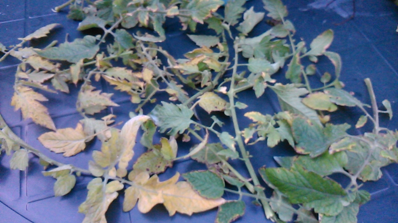 Kedves szaktanácsadó! Nem volt semmilyen. Permetezés. Csak kétkezes locsolás este v. Kora reggel. Az lehet, hogy nem jó, felülről locsoltam eddig most már a tövénél locsolás. Nagyon sok eső volt , meg tűző nap is. Csak zöldségekre való növény táp /Vitaflóra/ 2 hetente. Világos távozás 2 szer. Palántázáskor tehéntrágya a növény alá, gyökérhez nem ért. Most már rosszabb a helyzet. Küldök képet. Nem csak a paradicsom beteg hanem a paprika, /levelei összezsugorodnak, erek mentén buggyos/ de még a ribizli levele is szárad, szintén bokros. A paradicsom fele tönkre ment. De furán! Az ágyas felé gyönyörű, nő mint a bolond, a másik fele összezsugorodott, mintha elszakadt volna. Pedig rengeteg volt a csapadék