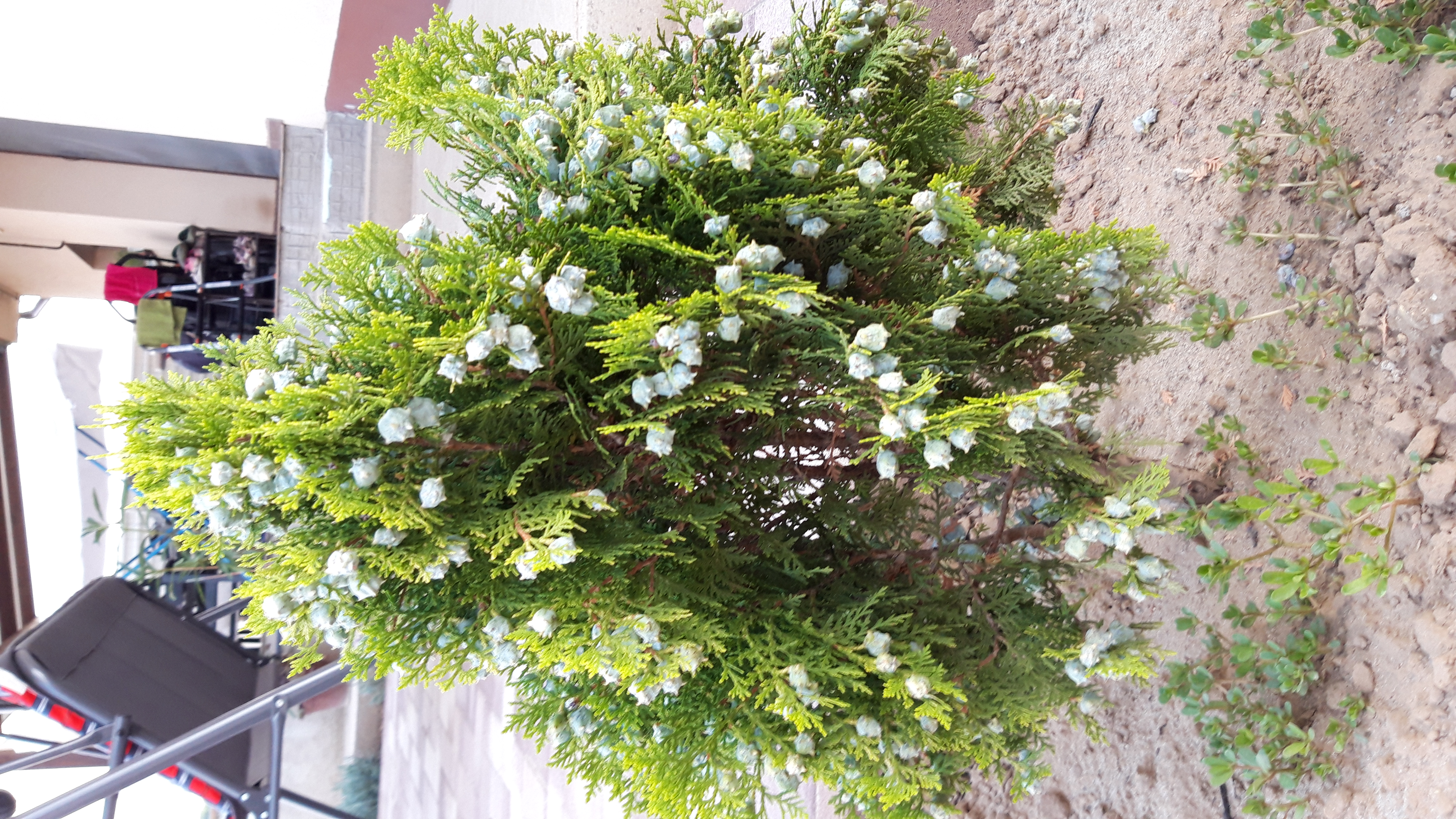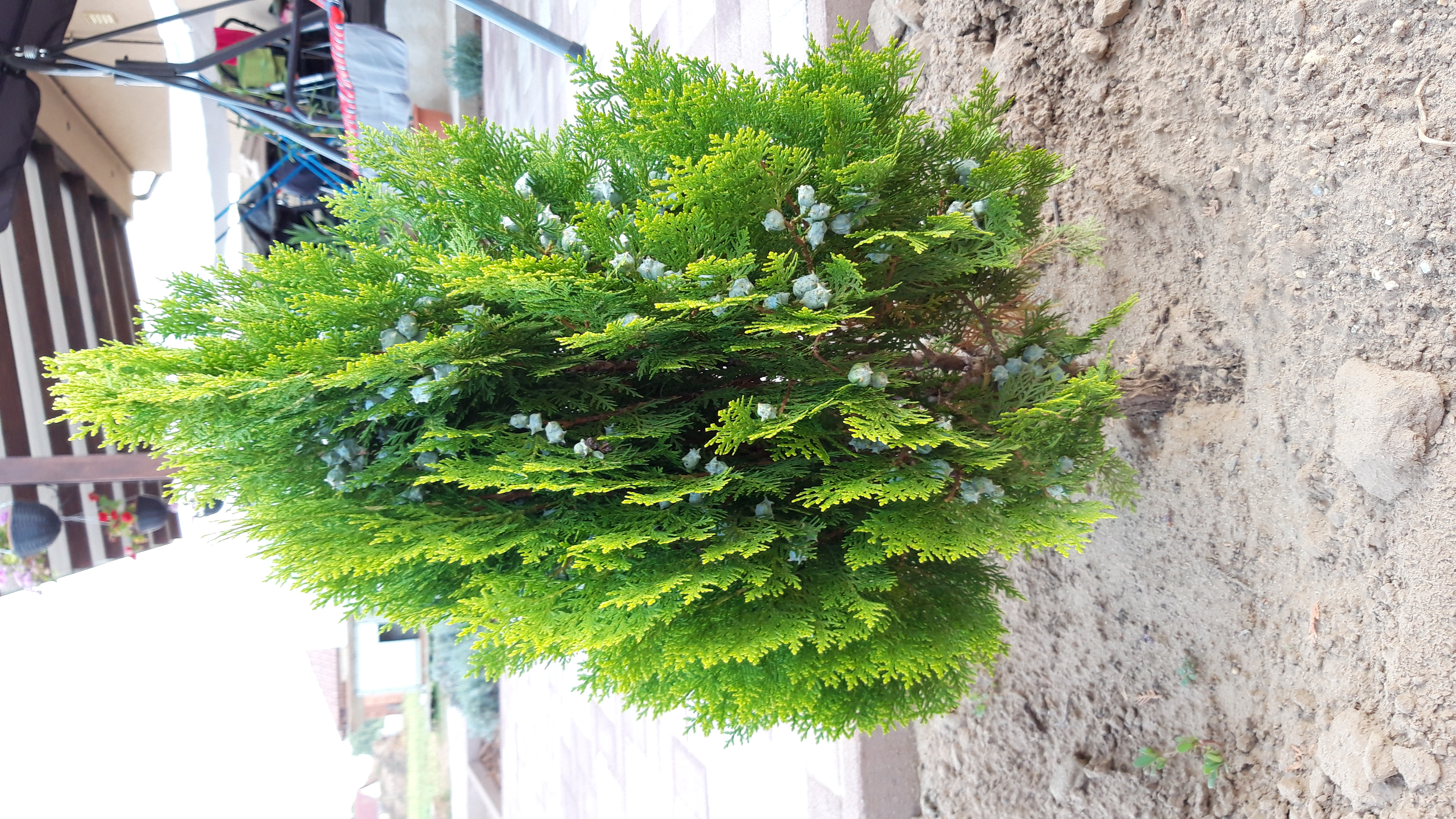 Thuja orientalis Aurea Nana. Kicsit szenved, azért hoz sok teremést. Többet kellene öntözni, és tápanyagot is kíván.