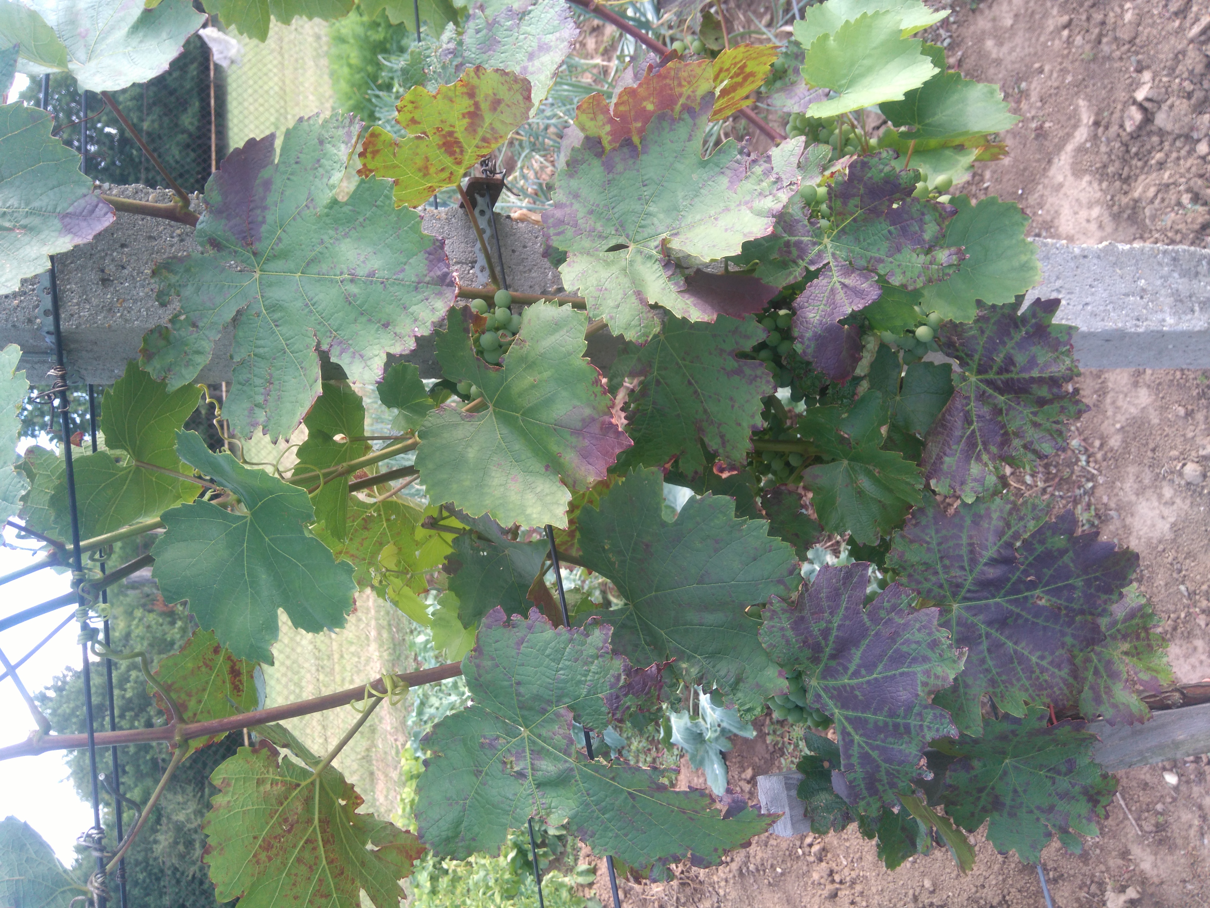 2015 tavaszán telepített Blauburger fajtájú szőlővel kapcsolatban lenne kérdésem. Már a tavalyi évben is megfigyeltem, de idén már az ültetvény 50%-án az alábbi levél elszíneződést tapasztalom(pirosodás, lilulás).
