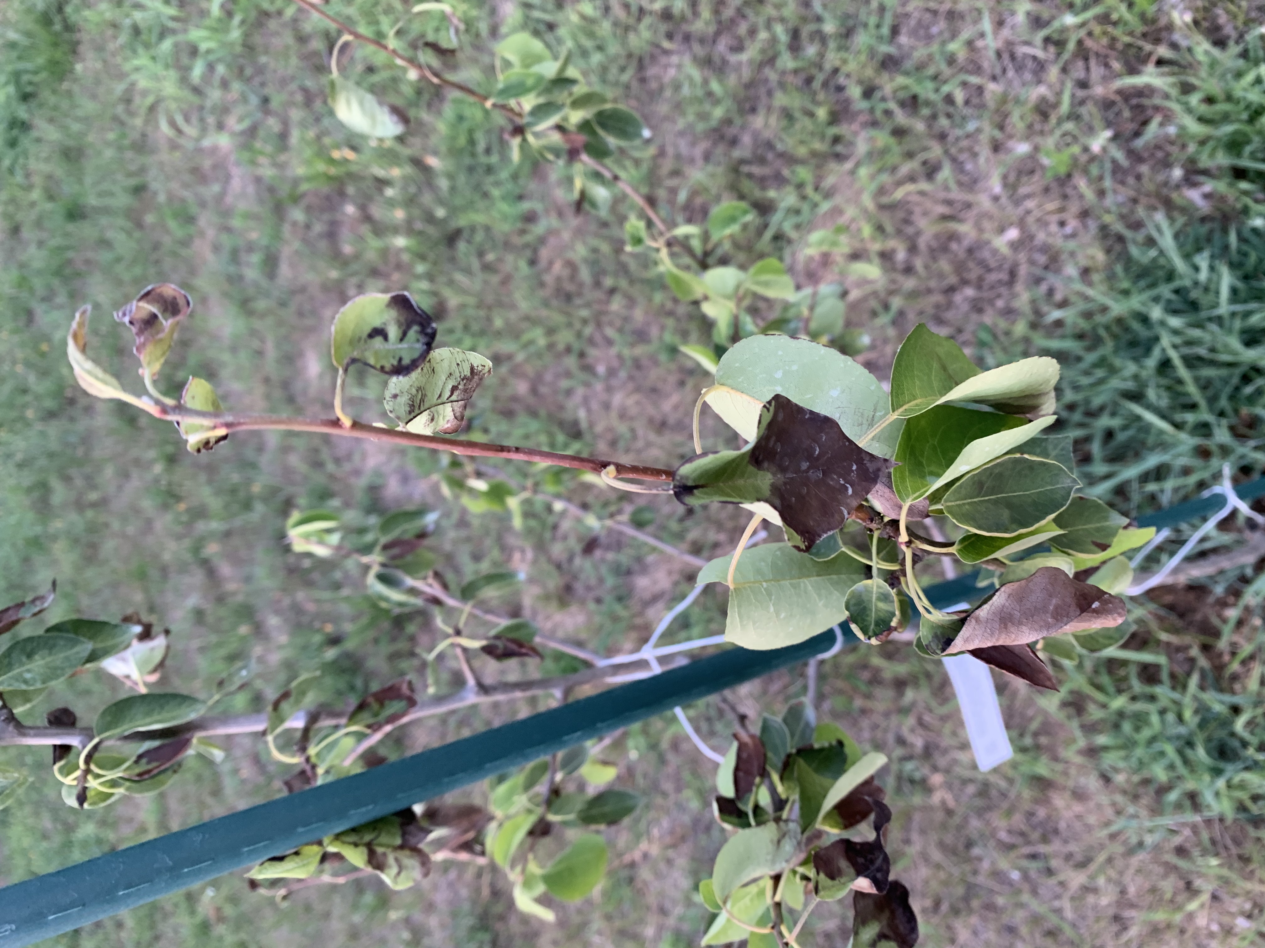 Ősszel ültettem ezt a kis fát. Tavasszal rezes lemosót kapott, rendszeresen permeteztem. Most viszont egy hét alatt a szépen fejlődő ágak ilyenek lettek. Mellékelem a mai öntözés után készült képet