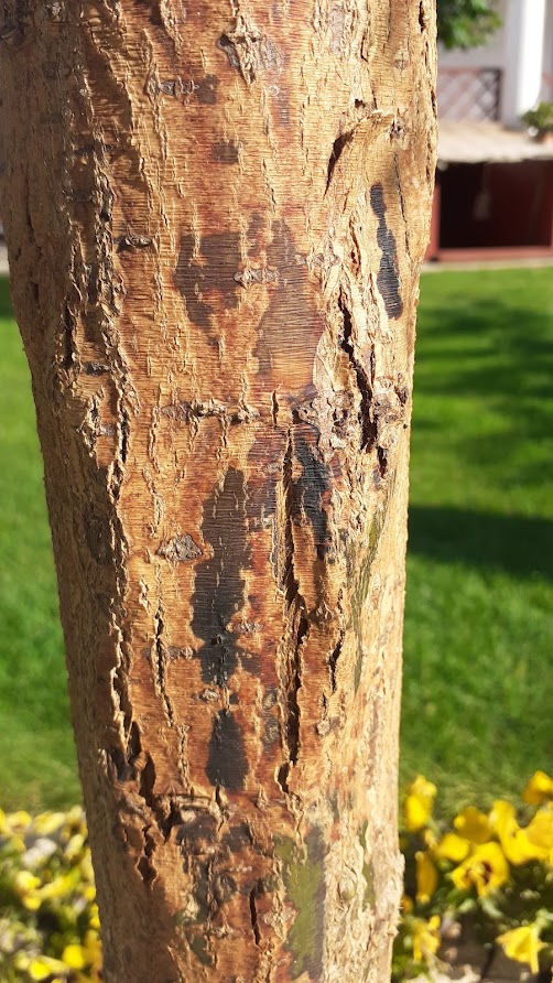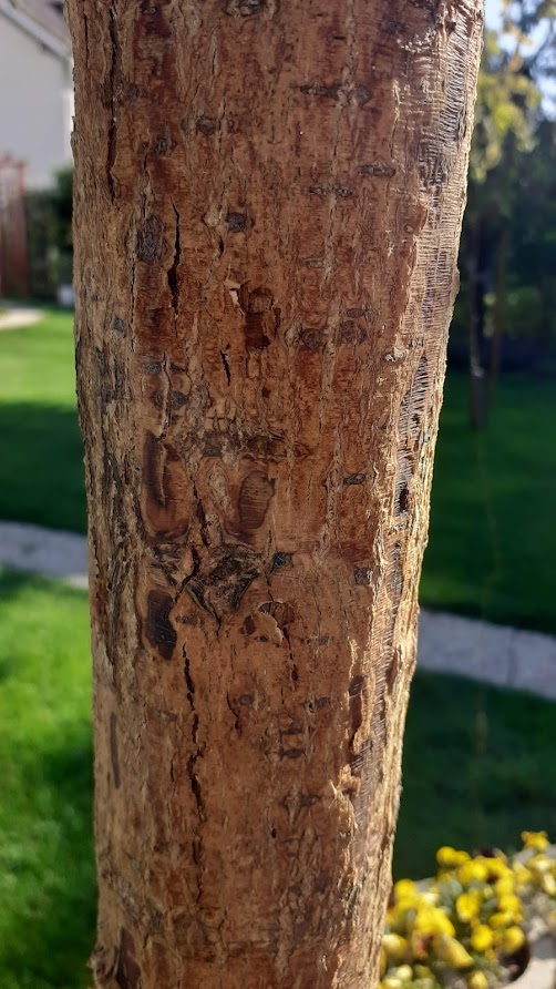 Mellékeltem az új fotókat. A törzse a fának egyszínű zöld volt, mint egy bambusz, aztán viszonylag rövid idő alatt barna lett, és repedések vannak rajta. Levele után megnéztem, és a repedéseknél benyomható, puha.