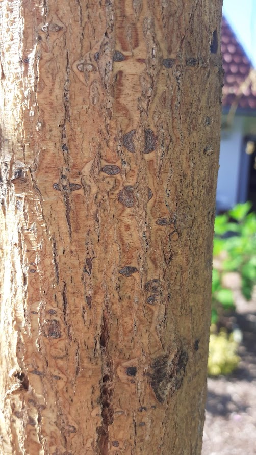Egy kertész javaslatára felszívódó rovarölővel lepermeteztük a fát, mert szerinte a tujákat is megtámadó rovar költözött a kéreg alá.