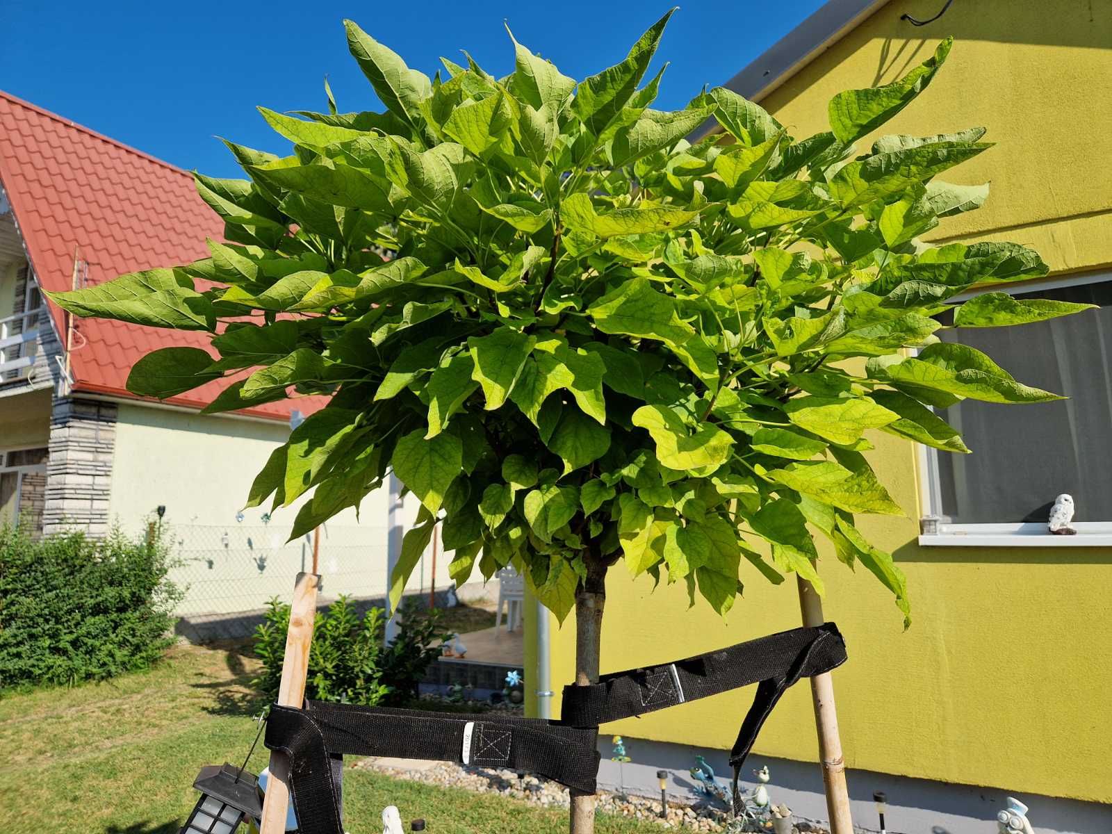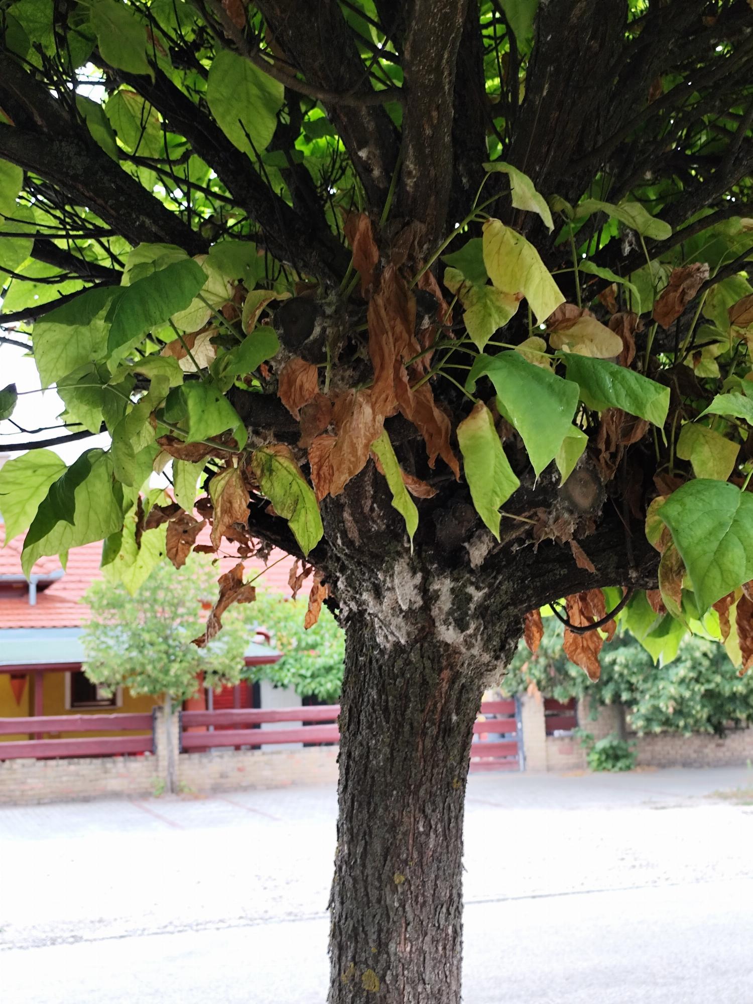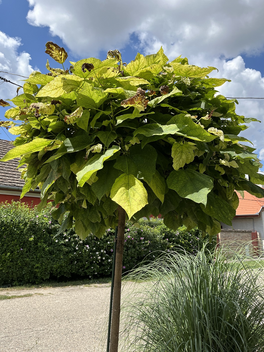 Május végén ültetett szivarfánk jelenleg így néz ki. Érdeklődni szeretnék, hogy kell -e tartanunk valami betegségtől, ami megtámadhatta a fát illetve milyen lehetőségeink vannak, hogy szebbé tegyük? Válaszukat előre is köszönöm!