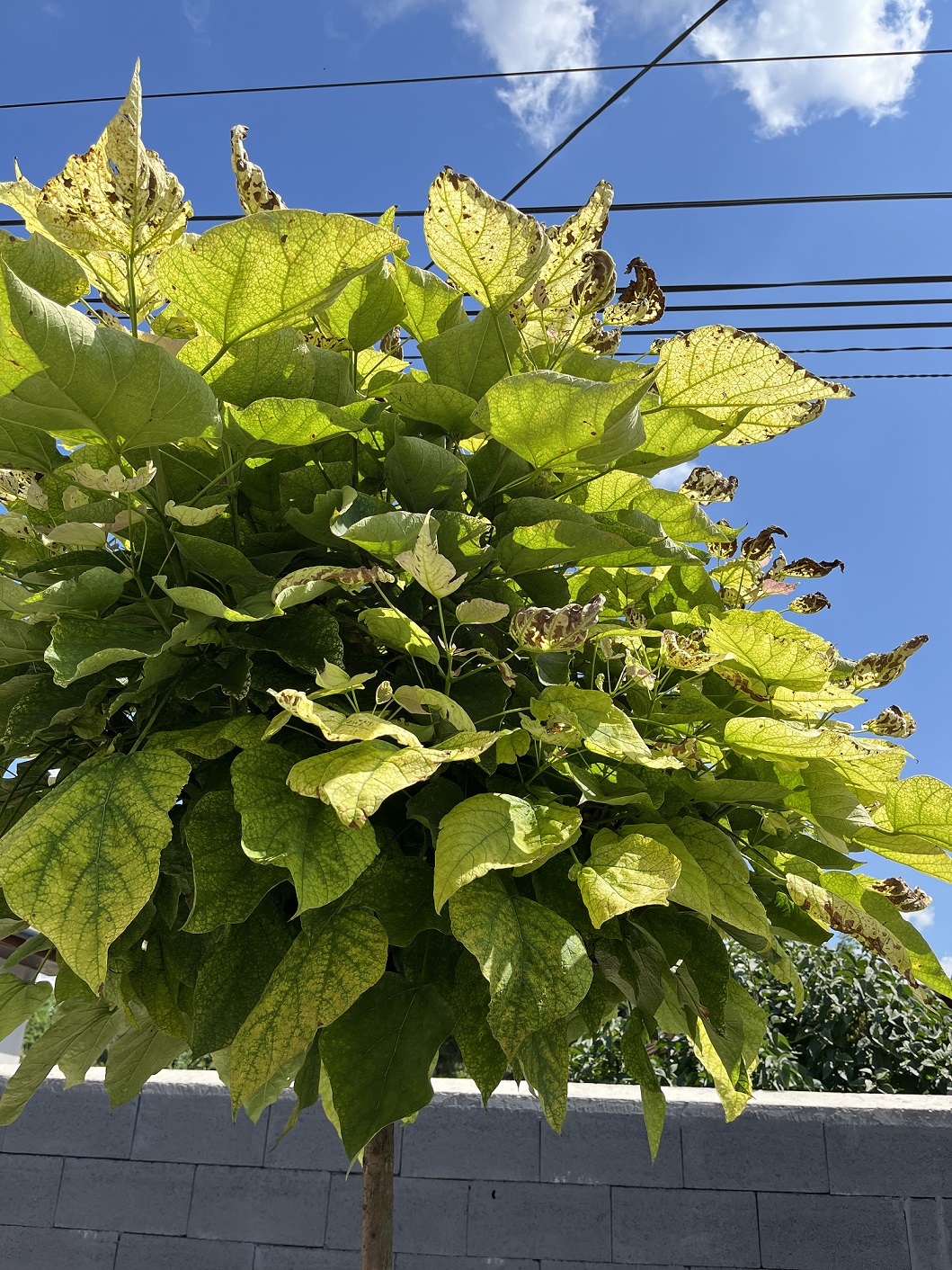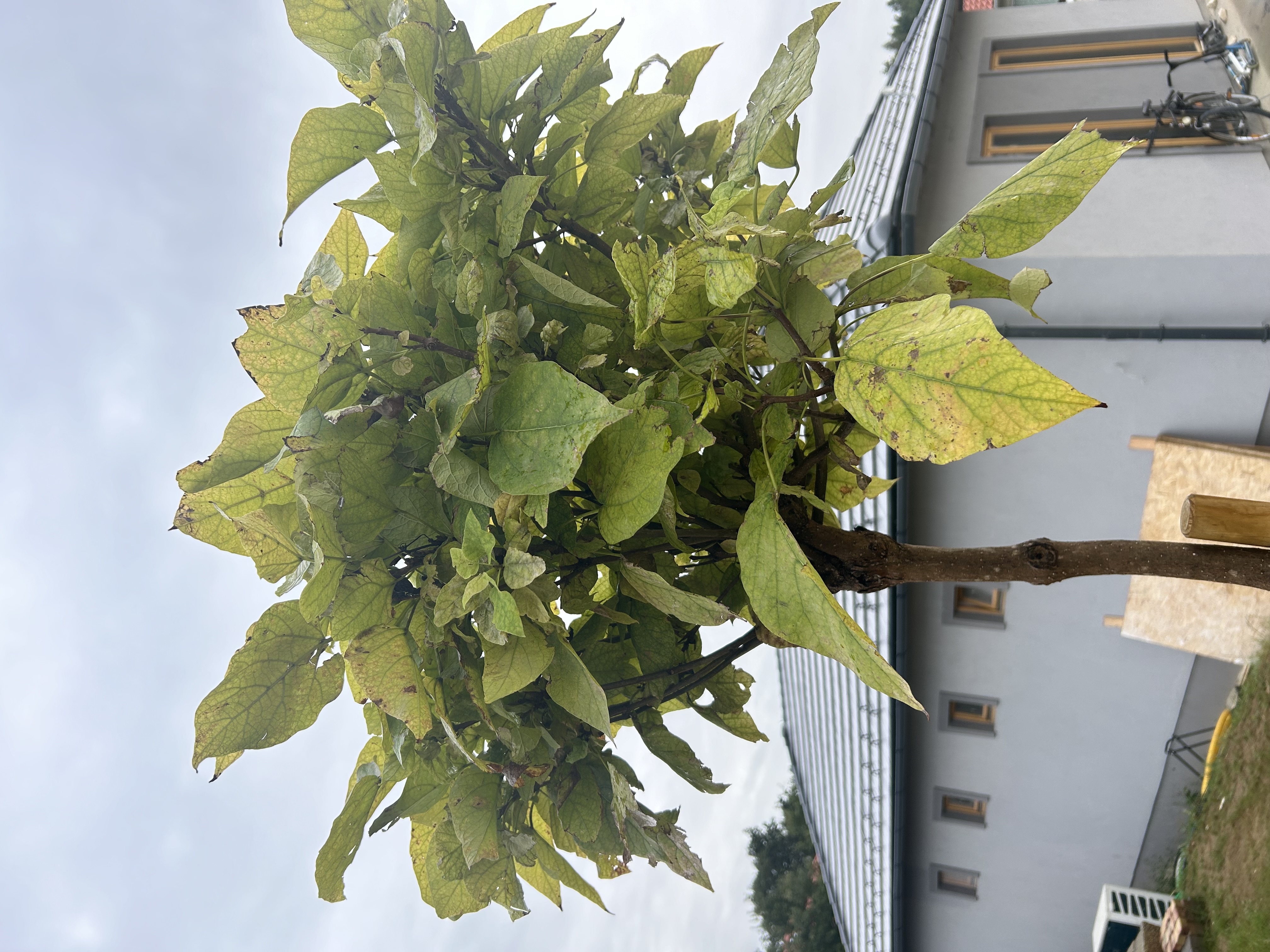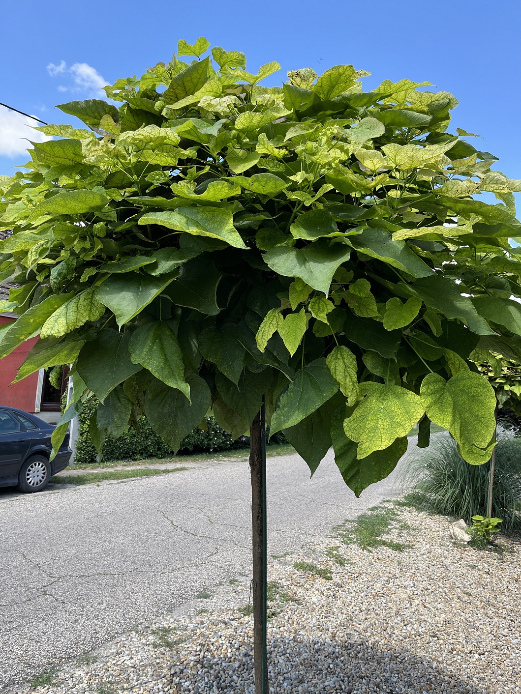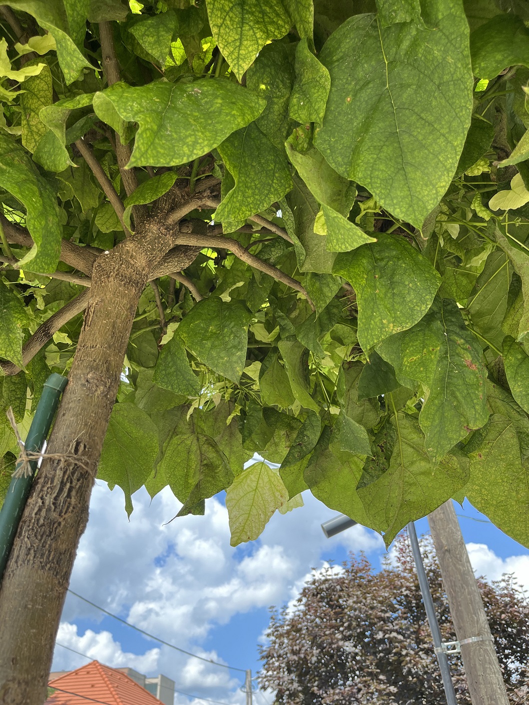 Május végén ültetett szivarfánk jelenleg így néz ki. Érdeklődni szeretnék, hogy kell -e tartanunk valami betegségtől, ami megtámadhatta a fát illetve milyen lehetőségeink vannak, hogy szebbé tegyük? Válaszukat előre is köszönöm!