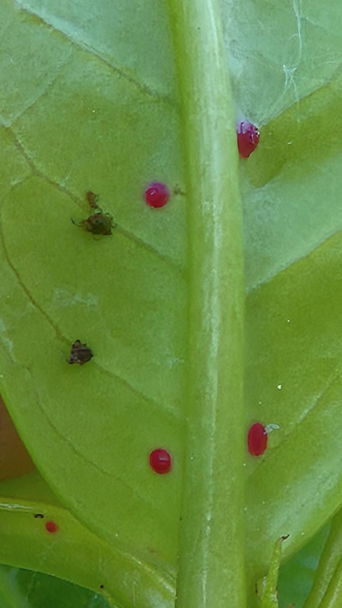 A segítségét szeretném a képen látható babérmeggy levél fonákján lévő apró piros pici cseppecskék miatt. Tűvel egyet megkarcoltam és elsötétedett , mögötte a levélen egy lyuk lett. Az előző évi leveleken látszik a nyoma, hogy hol lehettek. Mit lenne a javaslata.