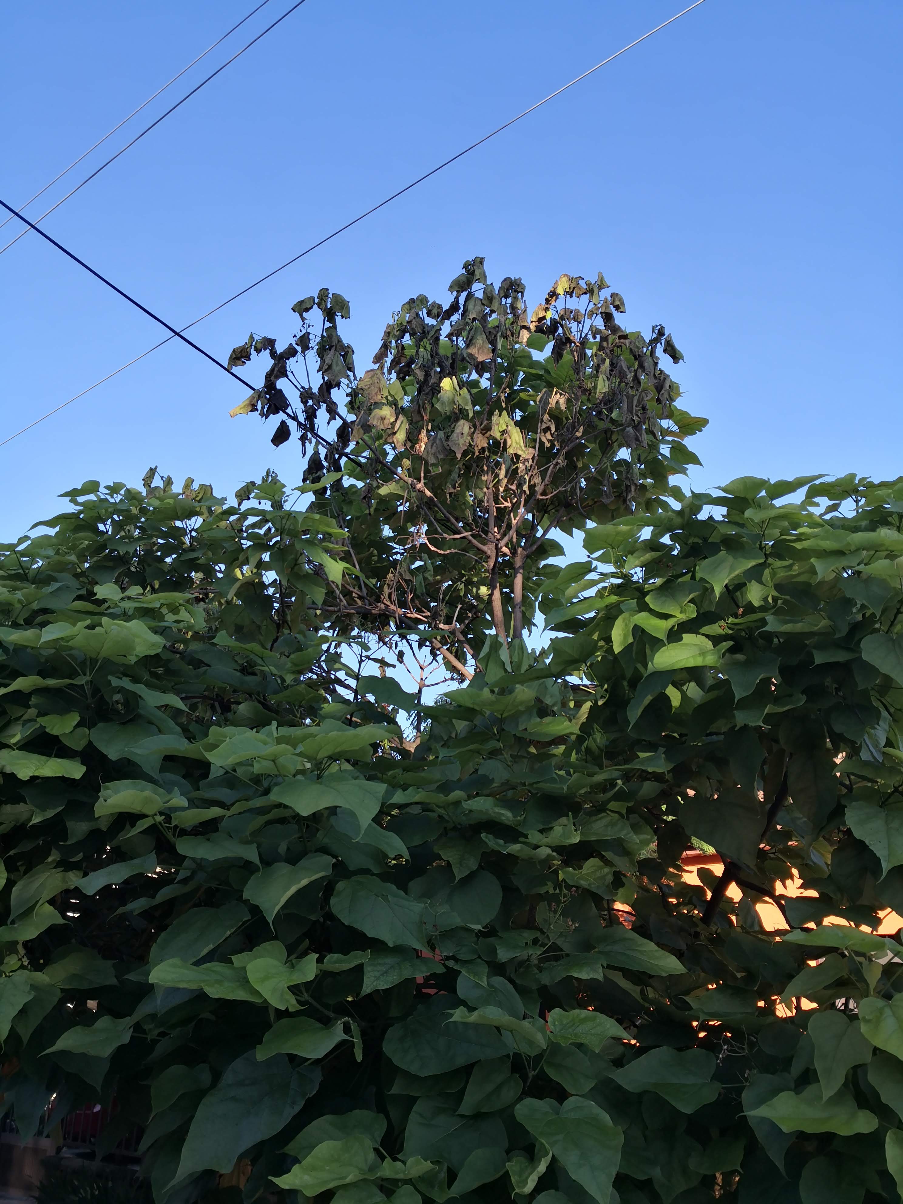 Két egymás melletti 10 éves szívarfa egyikén idén a fotón látható módon, különböző ágak esetében a levelek elhaltak. Nagy ijedségemre első körben Dithane M45 + Karate + Wuxal kombóval permeteztem le külső és belső oldalait a leveleknek, amennyire csak elértem. Nagy fákról van szó..kb 5 méteresek. Permetezés 2 méteres toldószárral,, kb 4 méter magasba tudtam nyúlni, a tetejét szórófej szabályozással elértem. Ugyanakkor a mellete lévő szivarfát is..csak úgy, megelőzés képpen, amely szerencsére nem betegedett meg hasonlóan. 10 nap után, Mospilan + Thiovit Jet + Wuxal kombóval permeteztem újra. A beteg fán, 3 főbb ágán lévő levelek teljesen elszáradva lógnak. Egyelőre nem látok további terjedést, viszont nem tudom mi tévő legyek a leszáradt levelekkel, illetve az érintett ágakkal kell kezdenem valamit vagy sem?