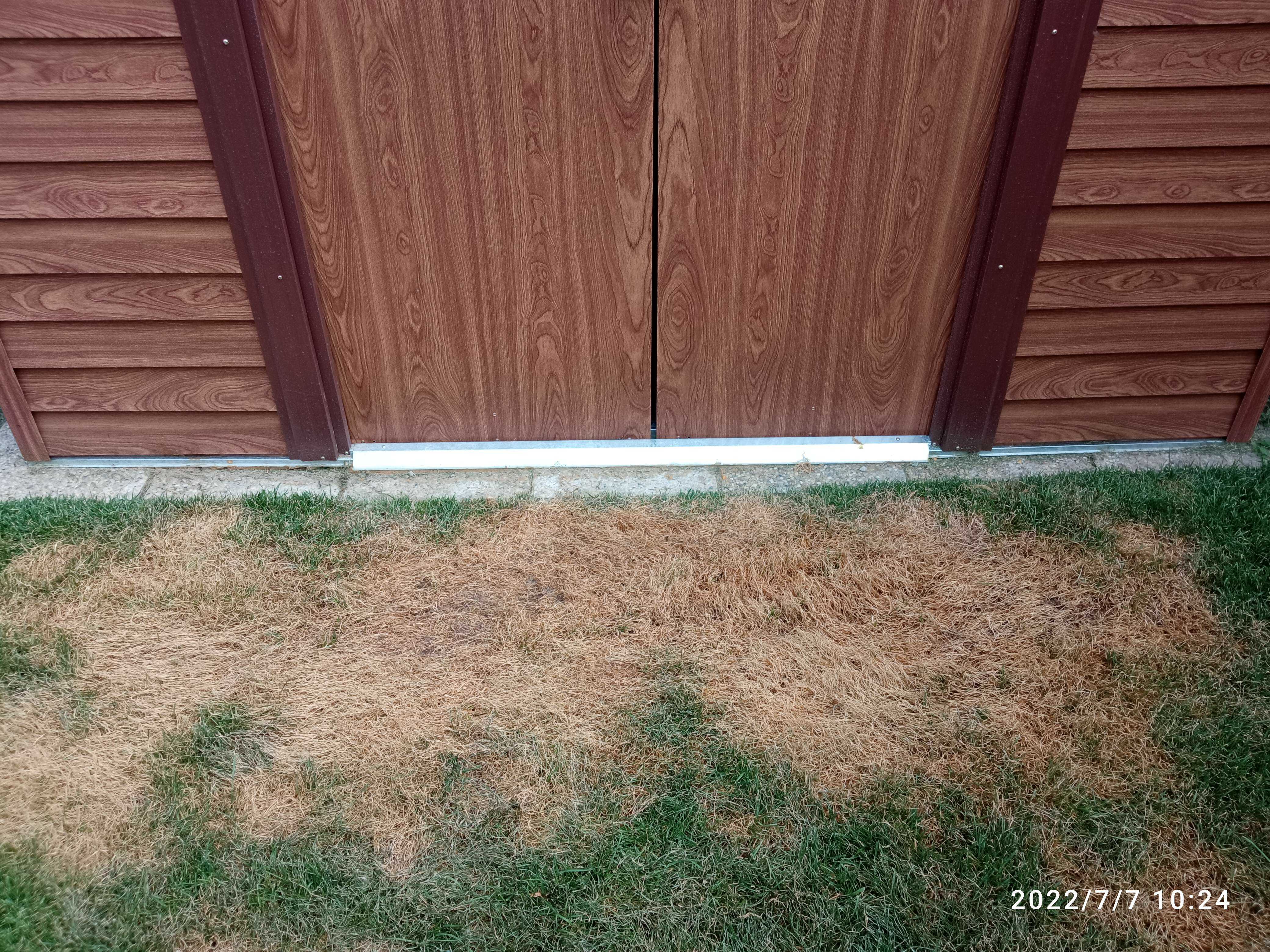 Másik gondom, hogy a kerti szerszámos ház bejárata előtt ki lett taposva a fű a bepakolas során (4.kép), majd pár nap múlva ebből indult ki egy nagy sárga folt, ahol a fű lassan teljesen ki fog menni és úgy látom, hogy növekszik a sárga folt. (2.kép)